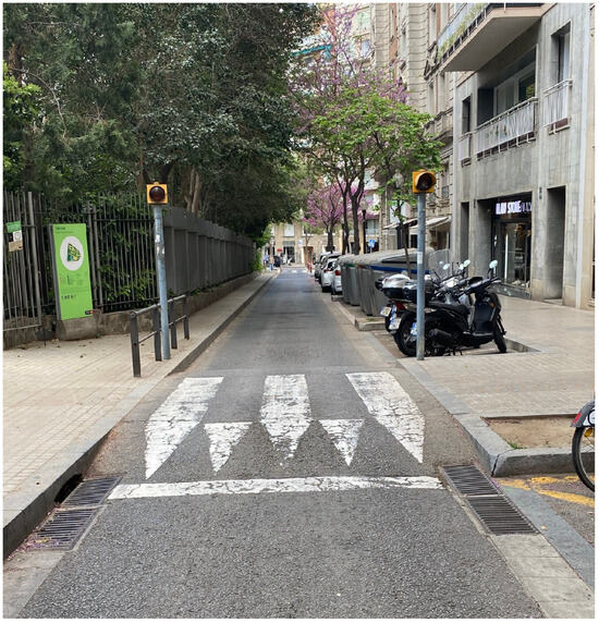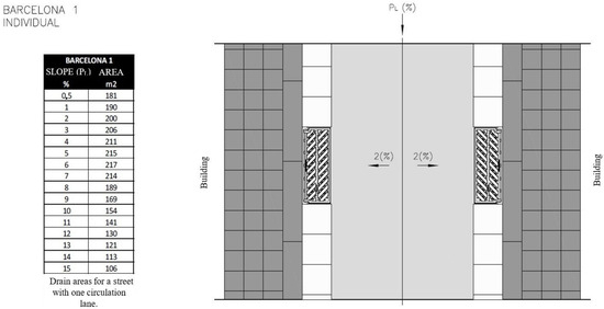 Furthermore, the public company Barcelona Cicle de l’Aigua SA (BCASA), which manages the urban water cycle of the city, published the results obtained from the analysis of the drained area (Figure 4), using several configurations of drainage elements according to their hydraulic efficiency, the geometry of the street, and the accomplishment of the official flood hazard criteria [20].