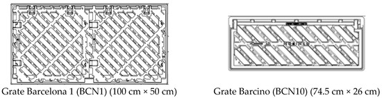 Two of the most common grates currently used in Barcelona [20] have been selected for this study. The geometric characteristics of these elements are shown in Figure 6 and Table 1.