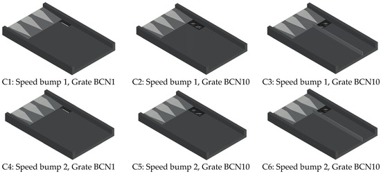 In accordance with the usual arrangements of the surface drainage elements in the paved streets of the municipality of Barcelona [21], different combinations between the analyzed grated inlets and the aforementioned speed bumps were considered, producing the following six configurations (C) that were analyzed through a tailored experimental campaign (Figure 8). According to official regulation EN-124 [22], grate BCN1 is classified as Type C and can be located only in a gutter street, while BCN10 is a Type D grate and can also be positioned transversally on a roadway. For this reason, grate BCN10 was also tested transversally.