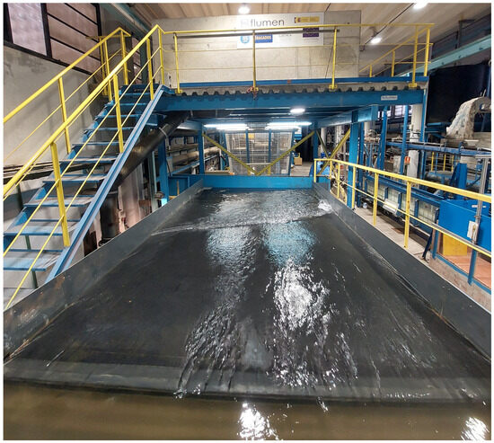 The testing facility (Figure 9 and Figure 10) used for this study consists of a platform designed to accommodate the storm drain inlet under investigation. The effective testing area dimensions on this platform measure 3 m in width by 5.50 m in length. These dimensions closely replicate the width of an urban traffic lane, thereby enabling capacity testing at full scale. Water circulates on the platform in the longitudinal direction. The platform’s slope can be adjusted in the flow direction (longitudinal slope up to 10% and transverse one up to 4%).