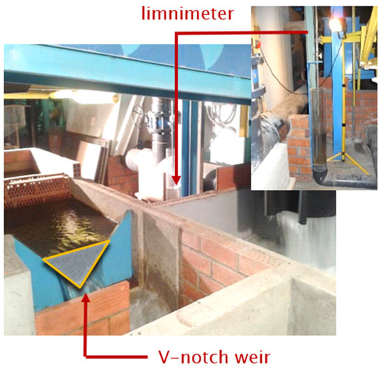 Water intercepted by the tested grate falls into a masonry collection chamber where flow energy is dissipated before being directed toward a triangular weir for discharge measurement using a staff gauge (limnimeter) that provides reading precision to one-tenth of a millimeter (Figure 11).
