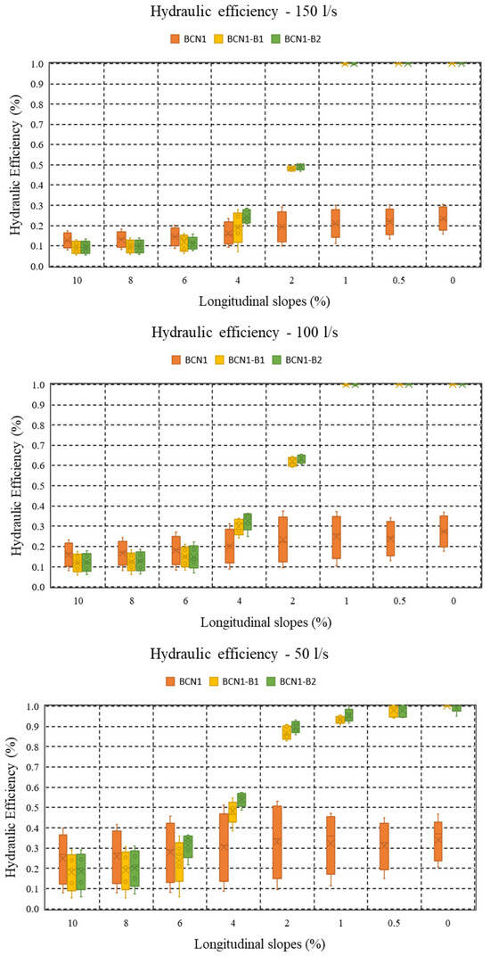 Focusing on the grated inlet BCN1 (Figure 12), for the three tested flow rates, it is possible to observe that for flat street conditions (longitudinal slopes of 0, 0.5 and 1%), the presence of the speed bumps (both types) ensure the whole collection for the flow rates of 50 and 100 L/s, while for the flow rate of 150 L/s, these values range between 90% and 100%. For the same longitudinal slopes, the hydraulic efficiency without speed bumps varies from minimum values of around 10% to maxim values of 45%.