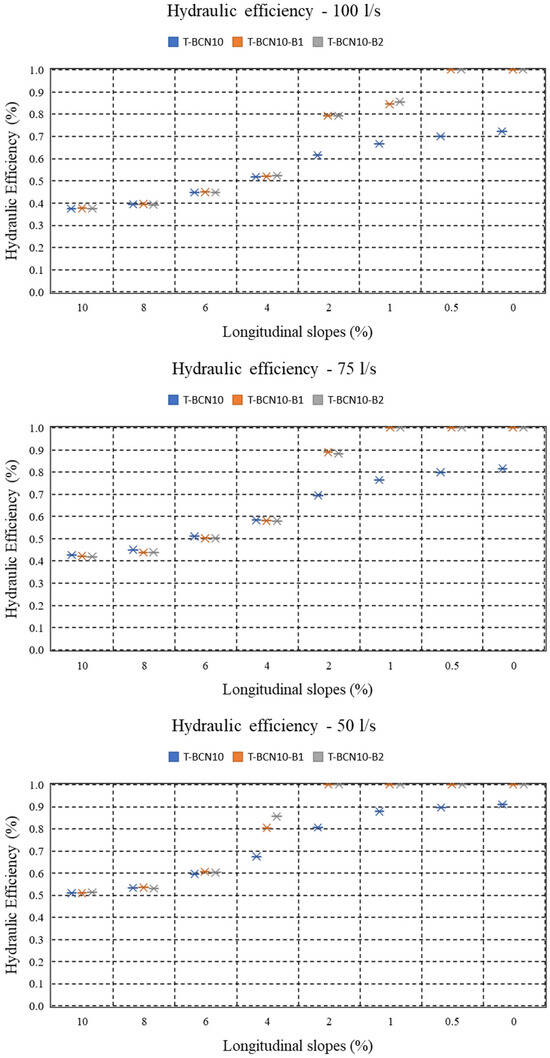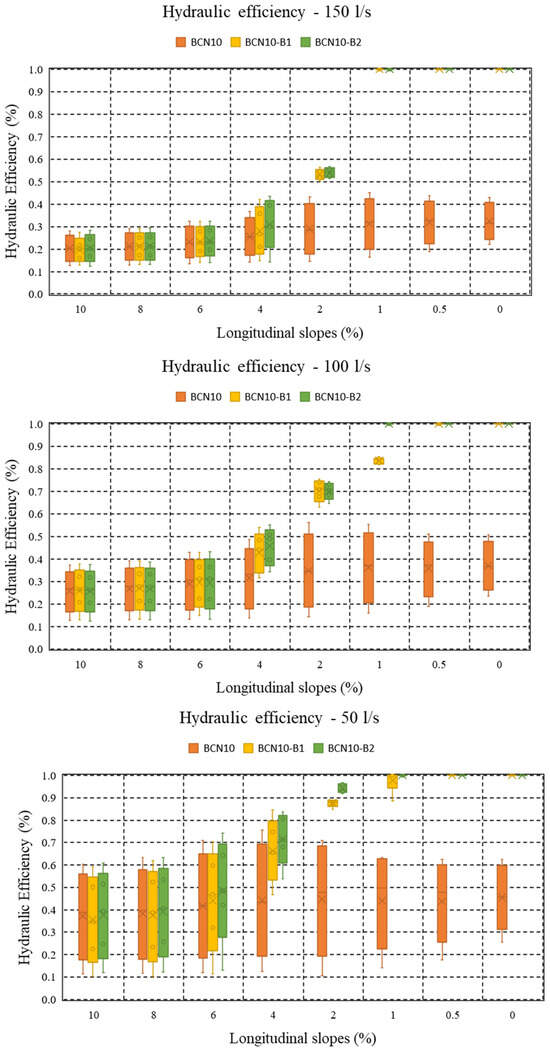 Similarly, regarding the grated inlet BCN10 (Figure 13), the general trend is the same. The most significant improvements are observed for a low longitudinal slope (from 0% to 1%). In these cases, the hydraulic efficiency of the grates with speed bumps are close to 100%, while for the conditions without them, the majority of these values range between 20% and 60%. Again, the differences decrease when longitudinal slope increases. Specifically, for a longitudinal slope of 2%, the hydraulic efficiency of this grate with speed bumps varies from 50% (for a flow rate of 150 L/s) to around 90% (flow rate of 50 L/s), while the conditions without speed bumps present values from 20% to 70%. The differences are still significant for the longitudinal slope of 4% (above all for the minimum flow rate of 50 L/s), while from the longitudinal slope of 6%, the results are practically the same for all the configurations and the effect of the speed bumps on the flow interception by the inlet is negligible.