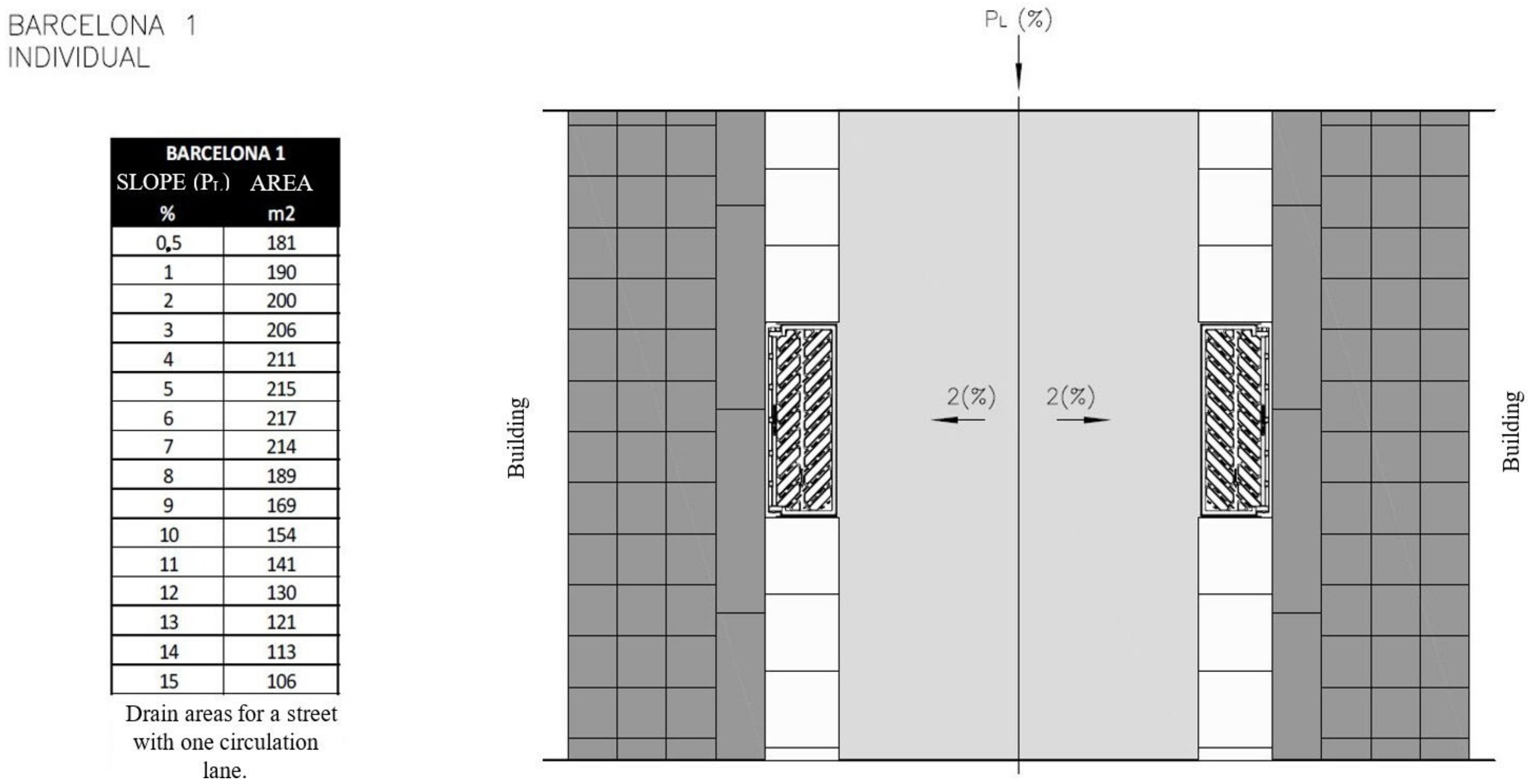 In accordance with the usual arrangements of the surface drainage elements in the paved streets of the municipality of Barcelona [