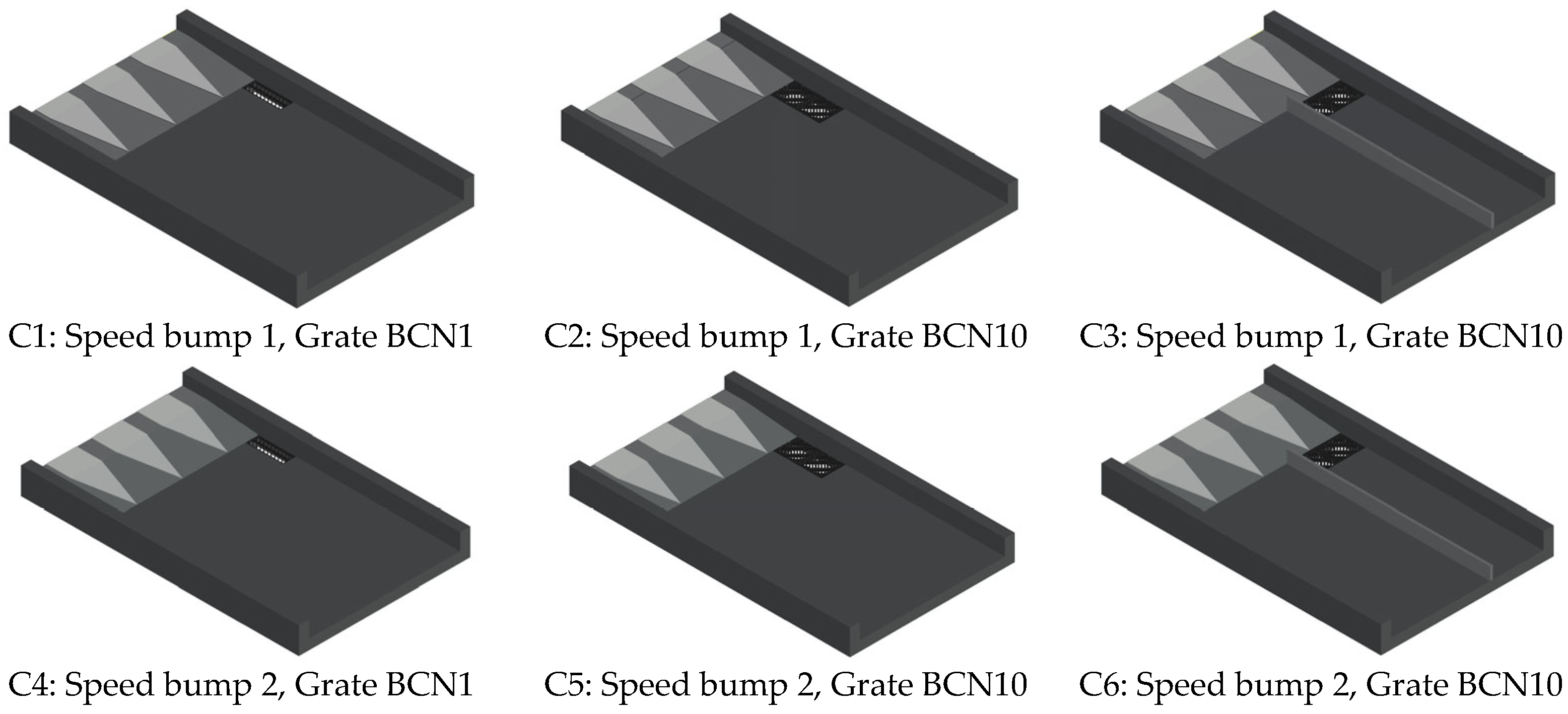 2.2. Set-Up of the Configurations of Grated Inlets and Speed Bumps to Be Analyzed