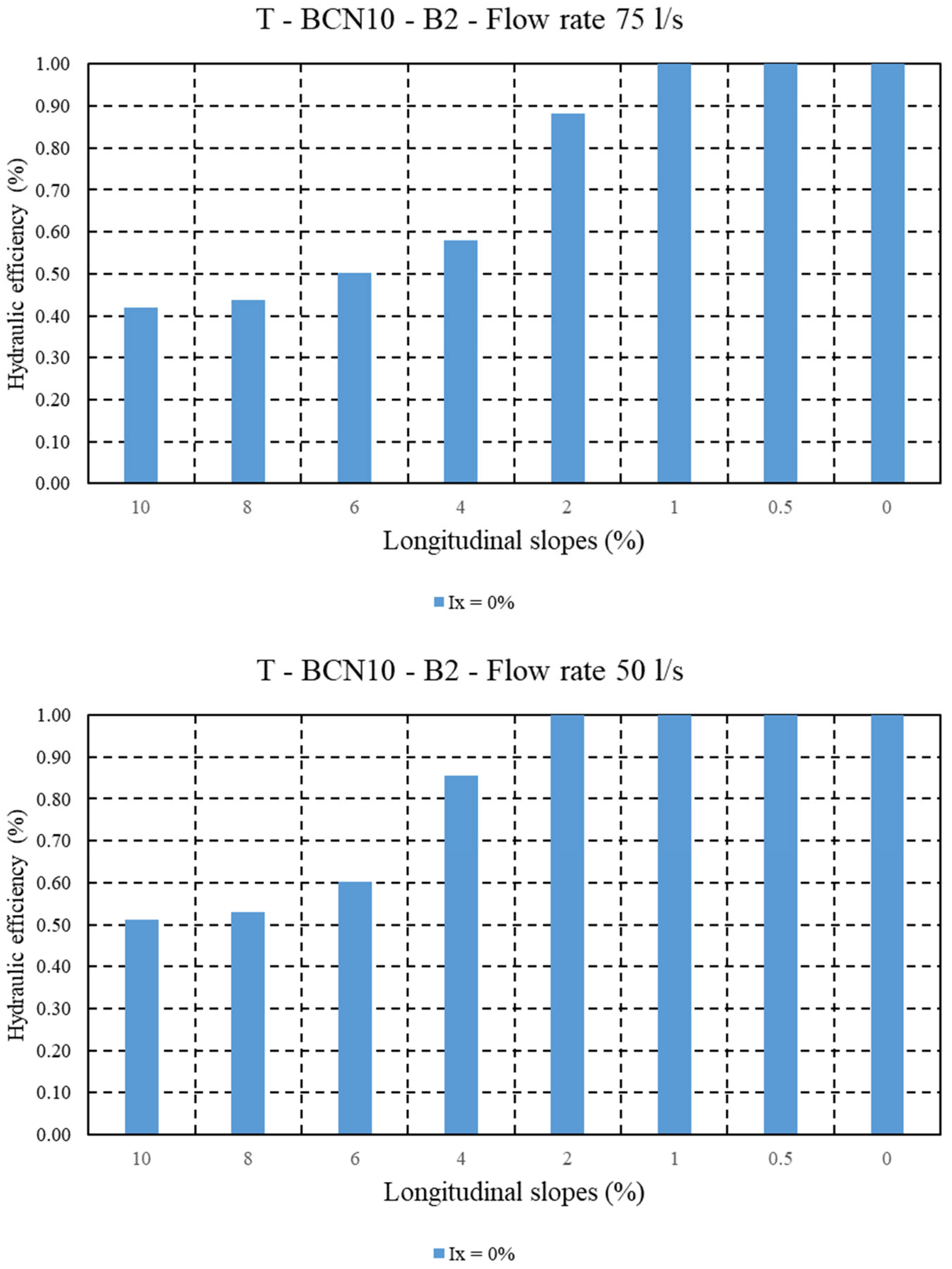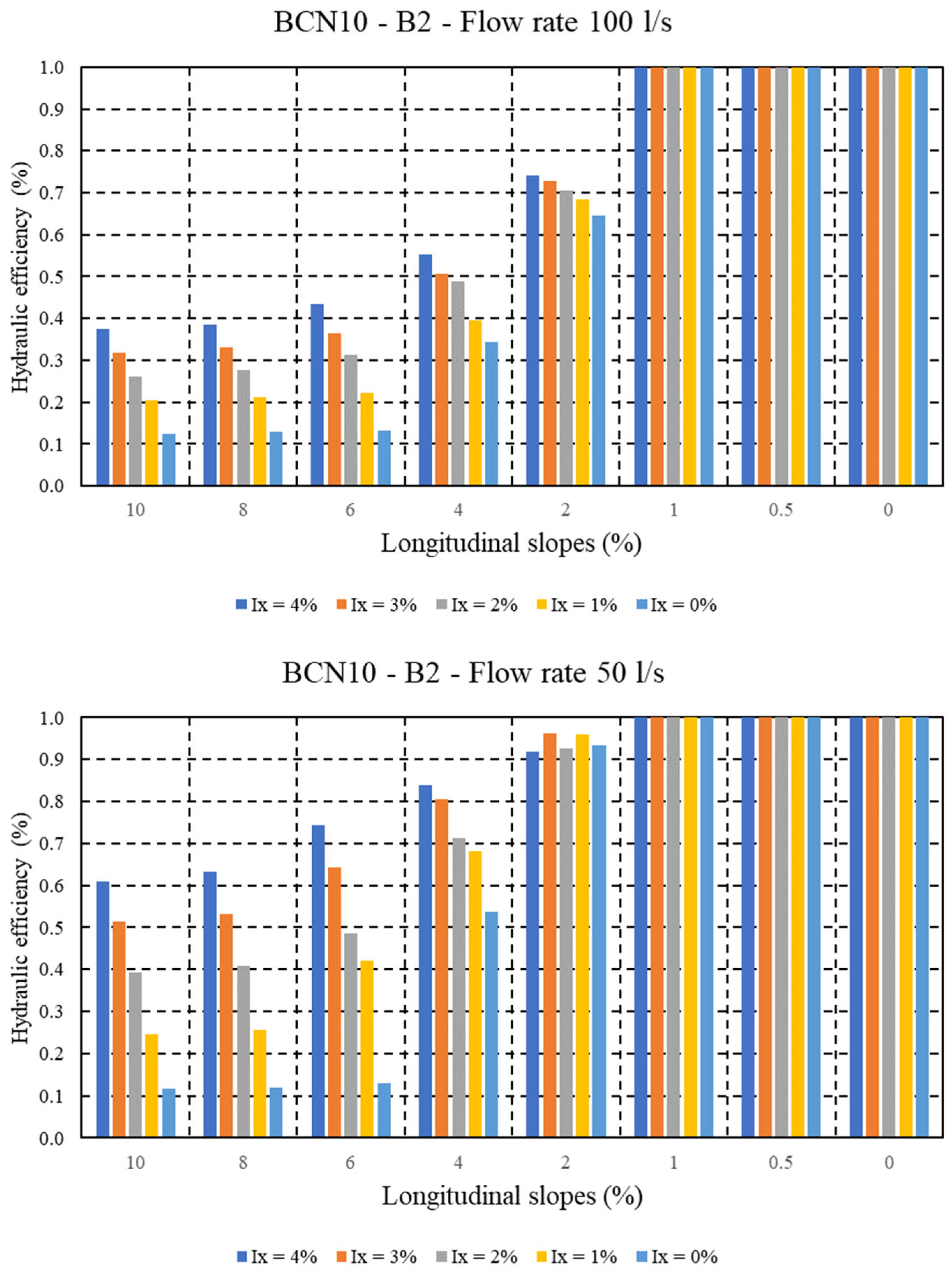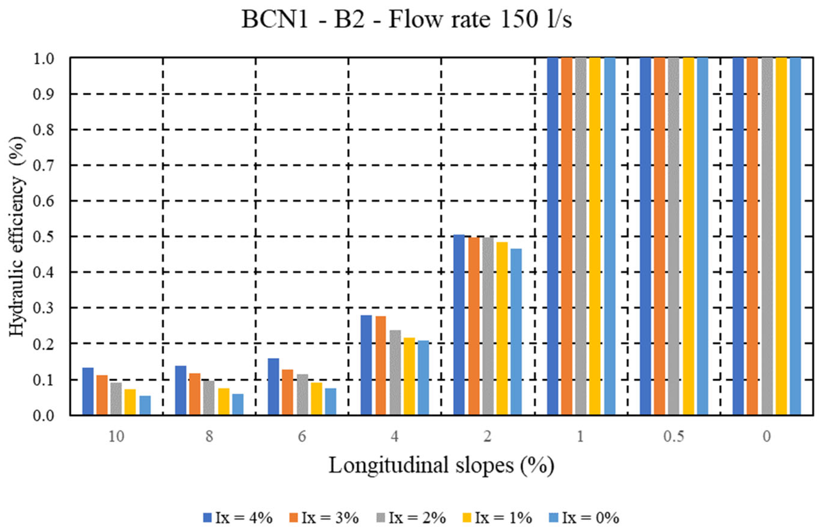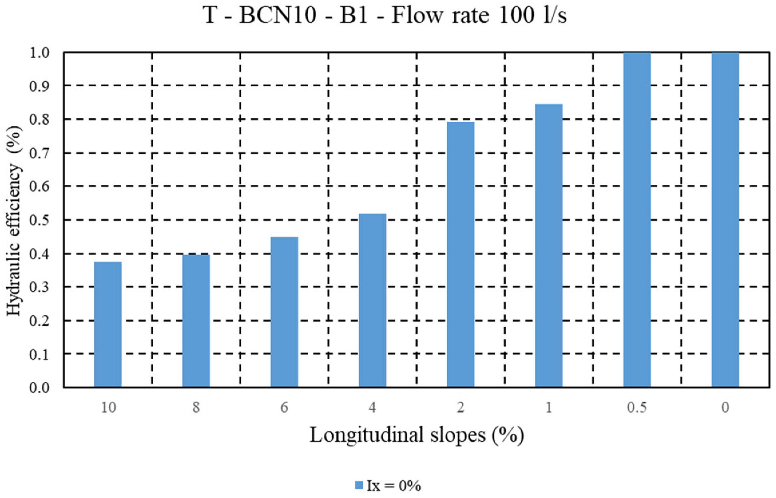 Hydraulic efficiency of the two tested grates (BCN1 and BCN10) was achieved considering several discharge rates circulating on the platform and several longitudinal and transverse slopes, as shown in