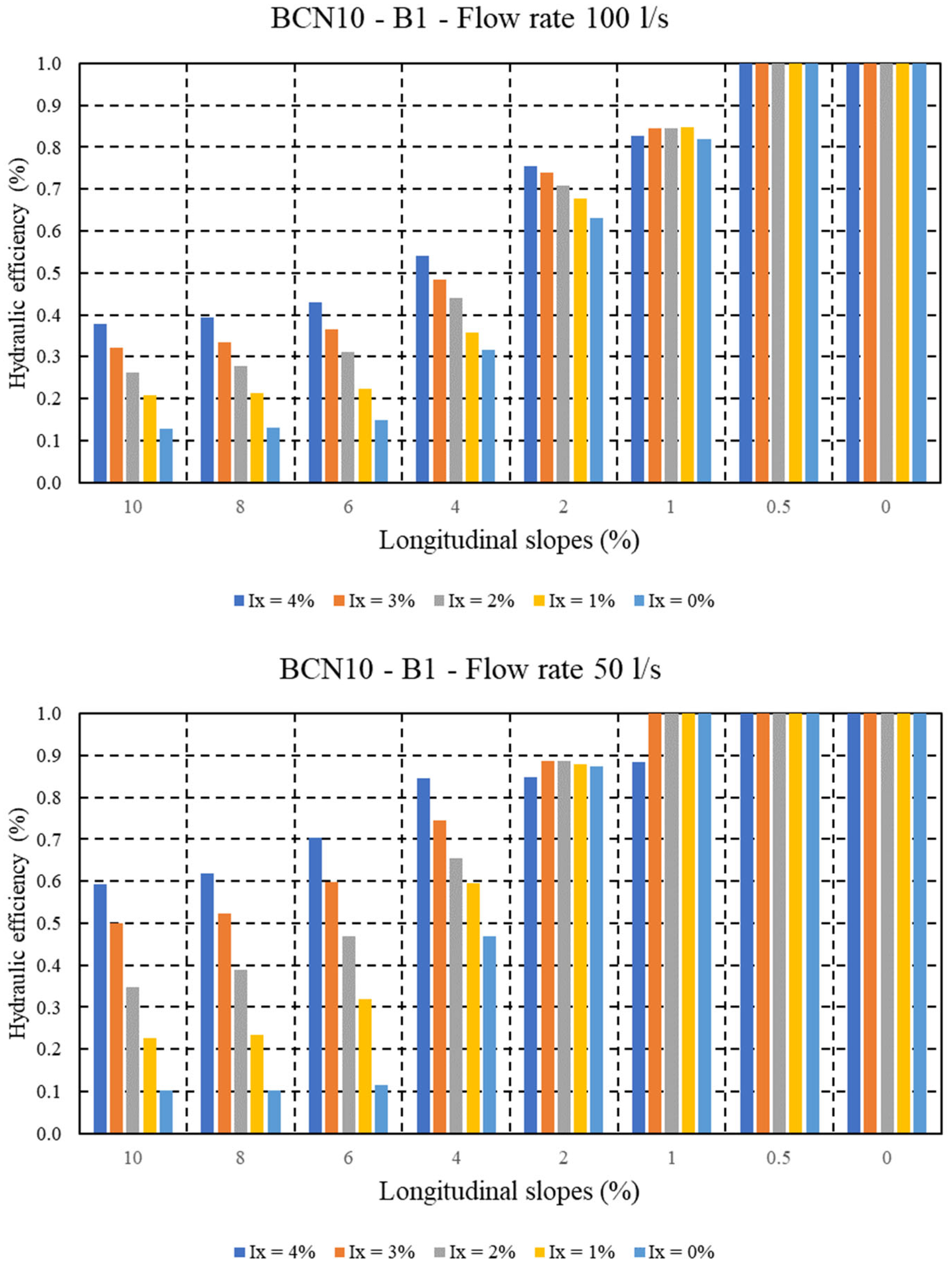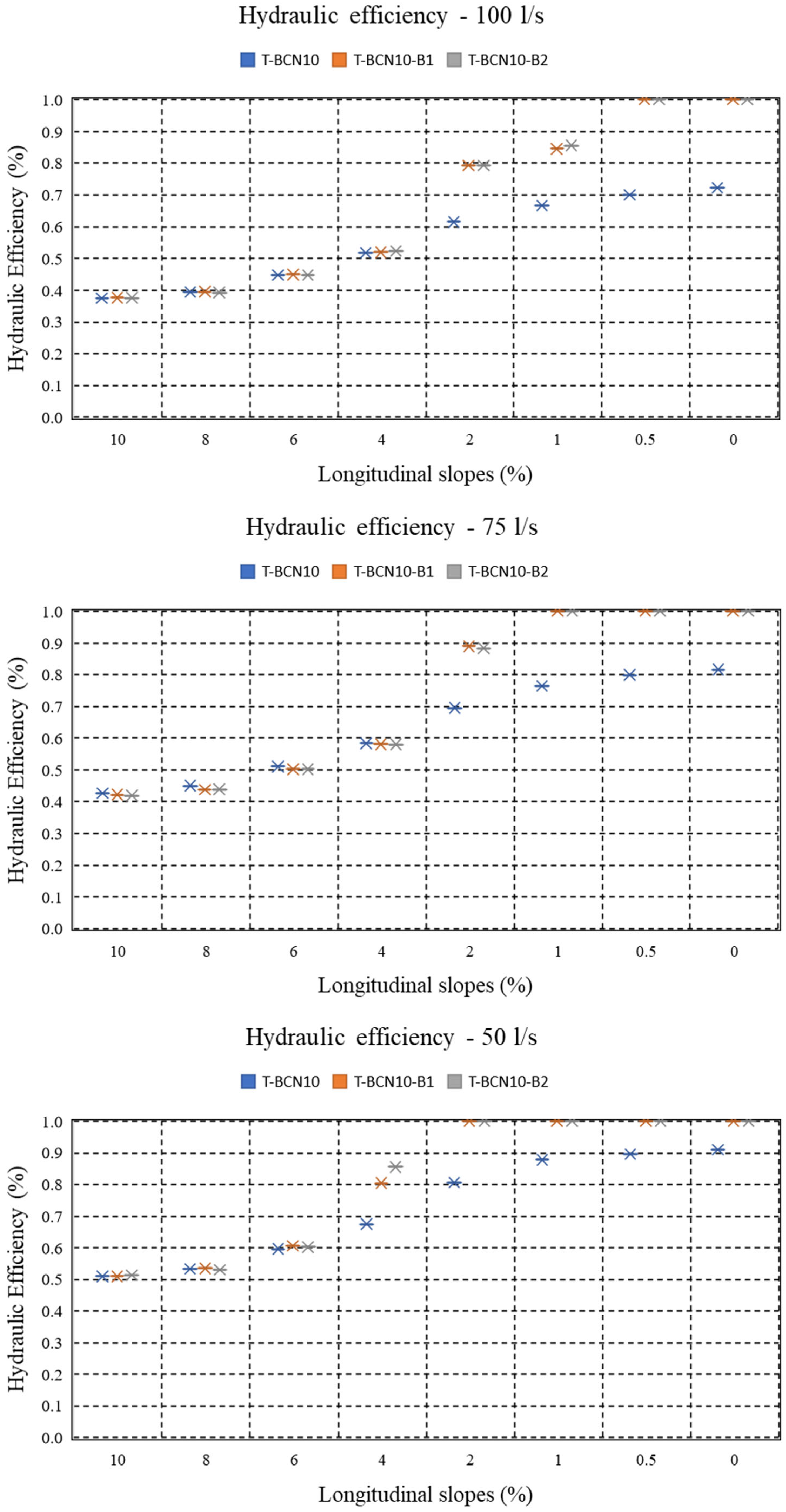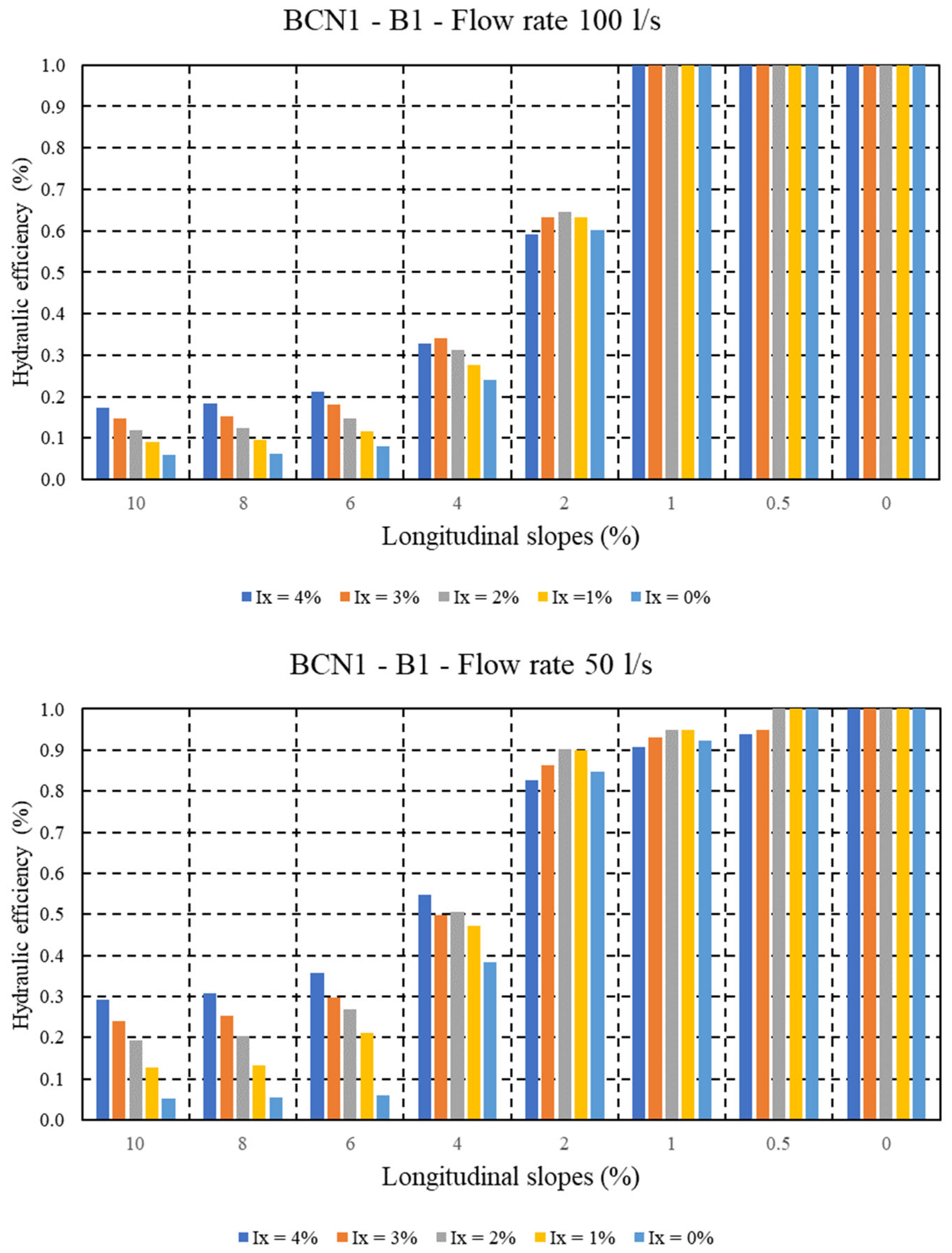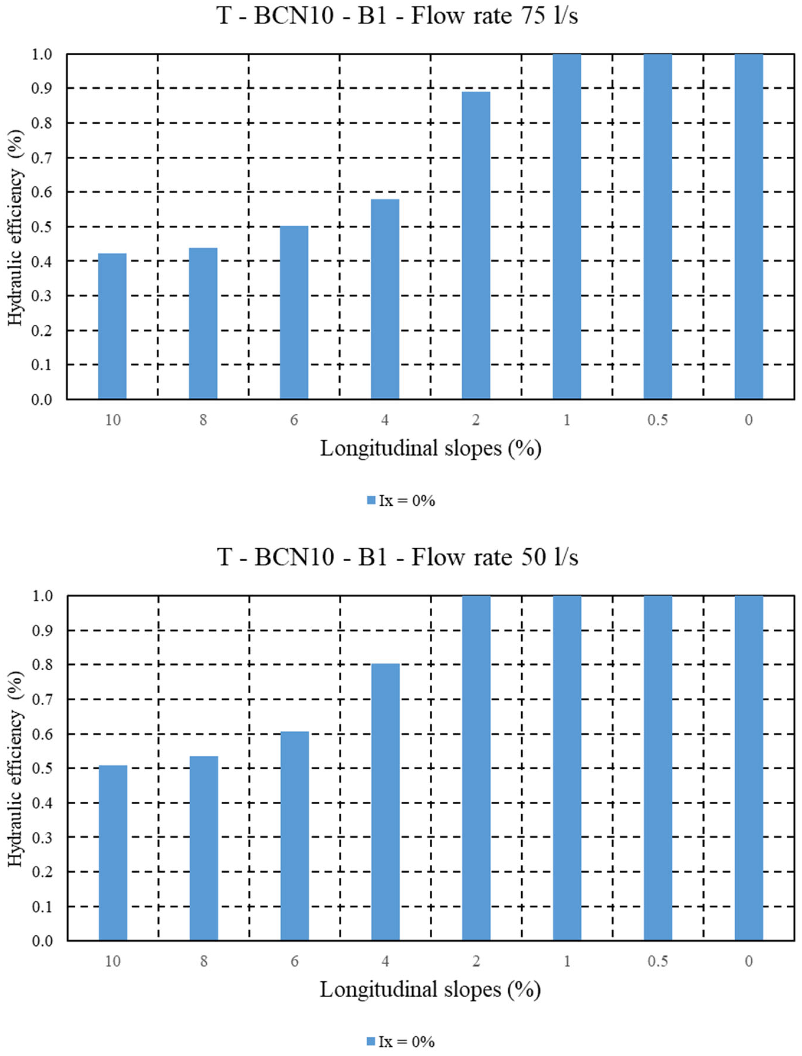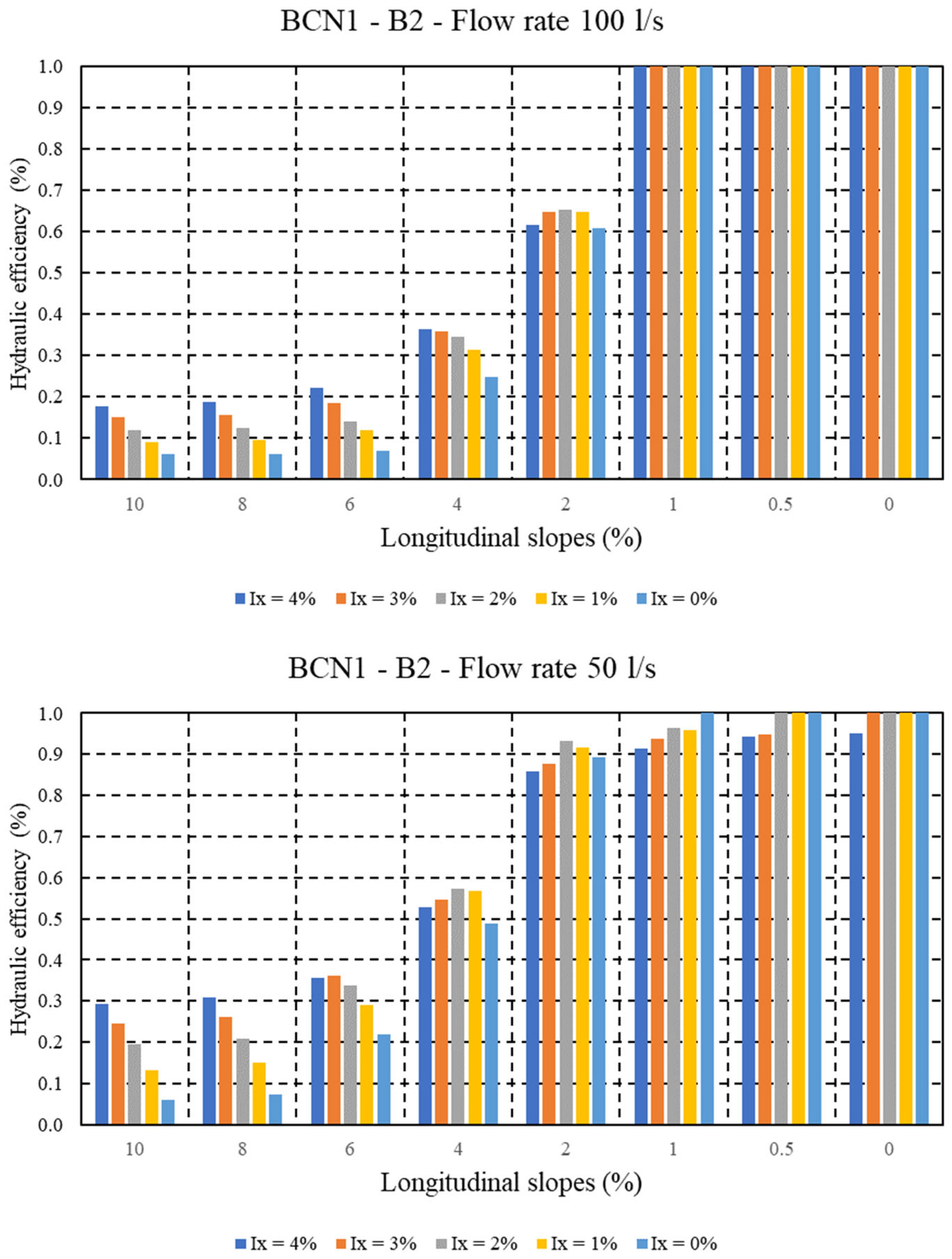 Hydraulic efficiency of the two tested grates (BCN1 and BCN10) was achieved considering several discharge rates circulating on the platform and several longitudinal and transverse slopes, as shown in