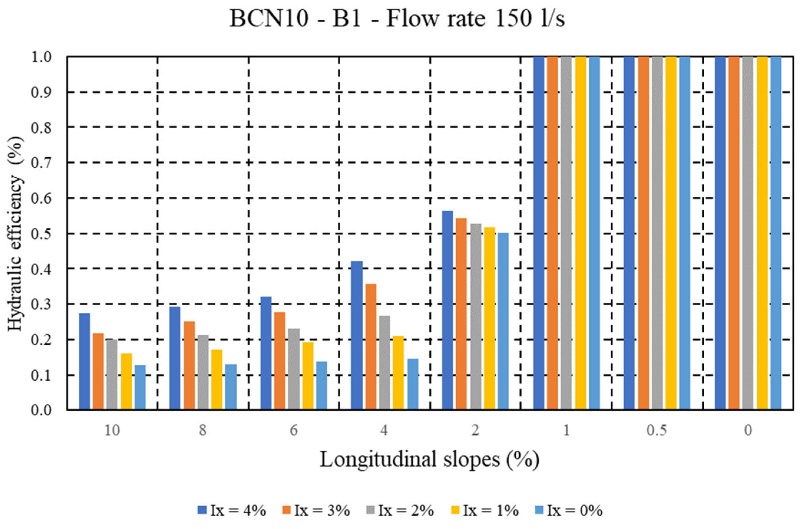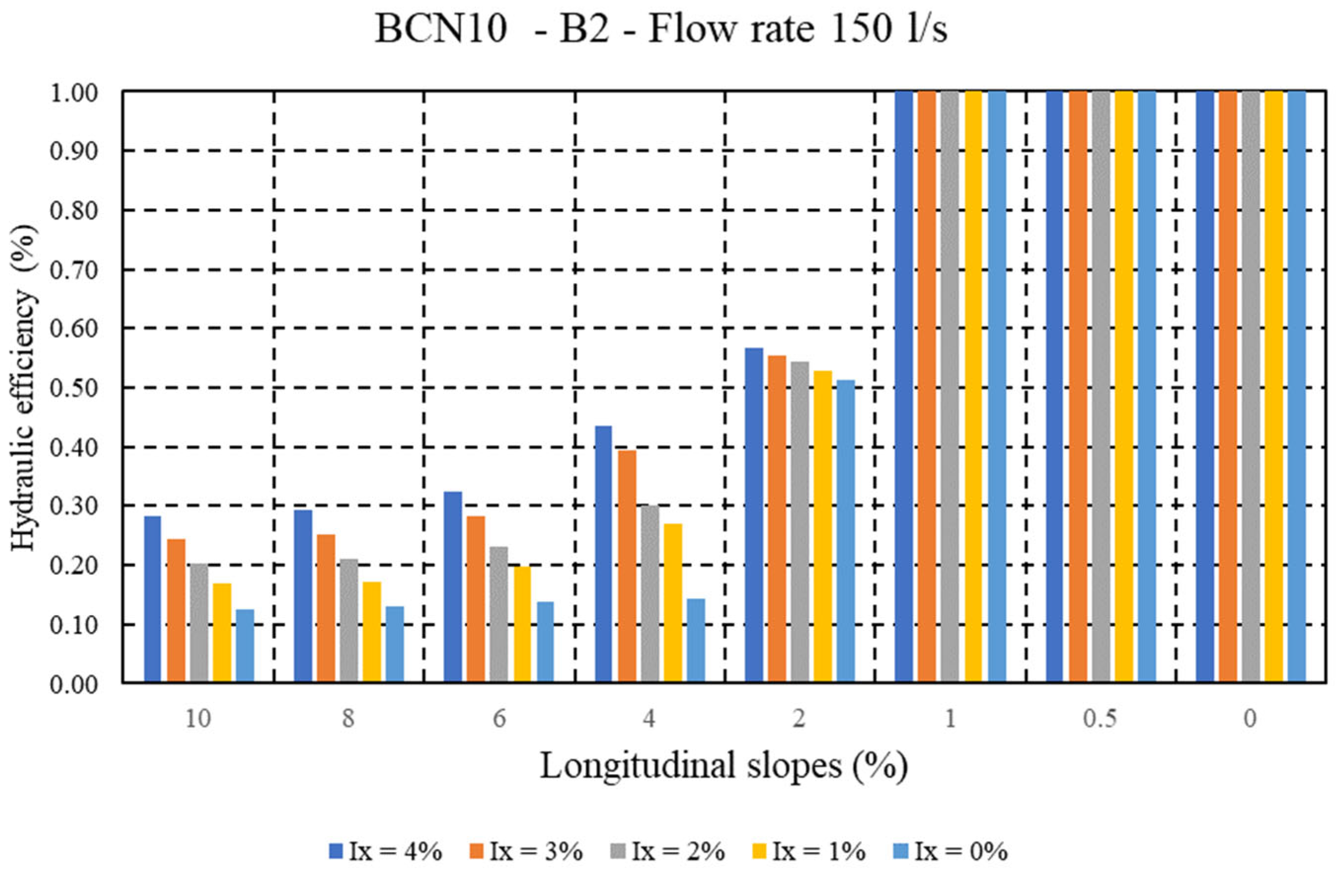 Figure 12), for the three tested flow rates, it is possible to observe that for flat street conditions (longitudinal slopes of 0, 0.5 and 1%), the presence of the speed bumps (both types) ensure the whole collection for the flow rates of 50 and 100 L/s, while for the flow rate of 150 L/s, these values range between 90% and 100%. For the same longitudinal slopes, the hydraulic efficiency without speed bumps varies from minimum values of around 10% to maxim values of 45%.