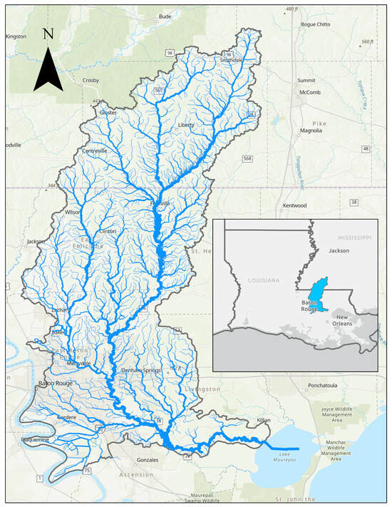 Map depicting Amite River basin used as an example application of the HRI-HydroName naming system.