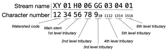 The data and the HRI_HydroName software that support the findings of this study are publicly available in HydroShare at https://doi.org/10.4211/hs.d3421b2099ee4e378e0005e2cfcb2338 (accessed on 1 October 2025) [17] and GitHub at https://github.com/ulfloodcenter/lwi-model-naming-conventions (accessed on 1 October 2025). The National Hydrography Dataset is available at https://www.usgs.gov/national-hydrography/nhdplus-high-resolution (accessed on 1 October 2025). A GIS representation of NHDPlus Version 2 streams that were labeled using the HRI_HydroName system can be accessed at the following data service: https://services9.arcgis.com/SfvtKAxCn62UWpRg/arcgis/rest/services/LWI_LabeledNHDStreams_2021_03_29/FeatureServer (accessed on 1 October 2025).