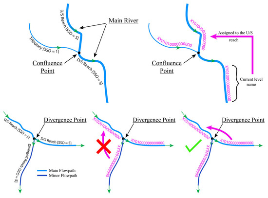 Similarly, at points of divergence, where a stream splits into multiple channels, the system distinguishes between the primary and secondary flow paths. Unfortunately, such distinguishing cannot be identified using Strahler’s stream ordering, as the common practice is to assign the same order for all streams (Figure 3), so a good knowledge of the stream is needed to provide an informed judgment. The dominant branch retains the identifier of the parent stream, maintaining continuity along the main channel. This rule ensures that each flow path is uniquely identified while still reflecting its relationship to the originating stream.