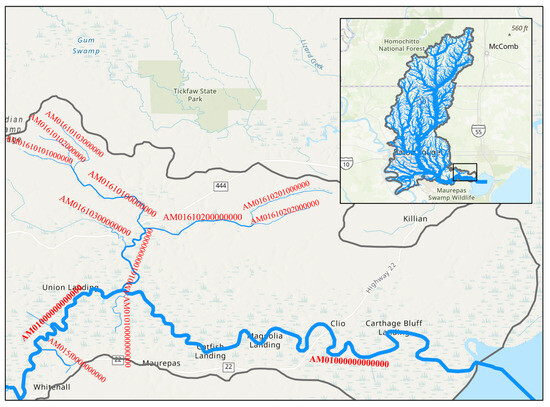 The HRI-HydroName system was applied to the Amite River Basin, which was assigned the watershed code “AM” as a mnemonic of its name. The watershed has only one outlet, where its stream was assigned the main stem level with value of 01, and then padded with zeros to fill a 16-character space making the whole ID of the stream according to the HRI-Hydroname “AM01000000000000” (Figure 4). Using this code as the foundation, identifiers were generated for the mainstem of the Amite River and systematically propagated upstream through its tributary network.