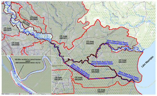 Example from the Amite Basin HEC-RAS model showing HRI-HydroName system applied for river reaches and 2D areas.