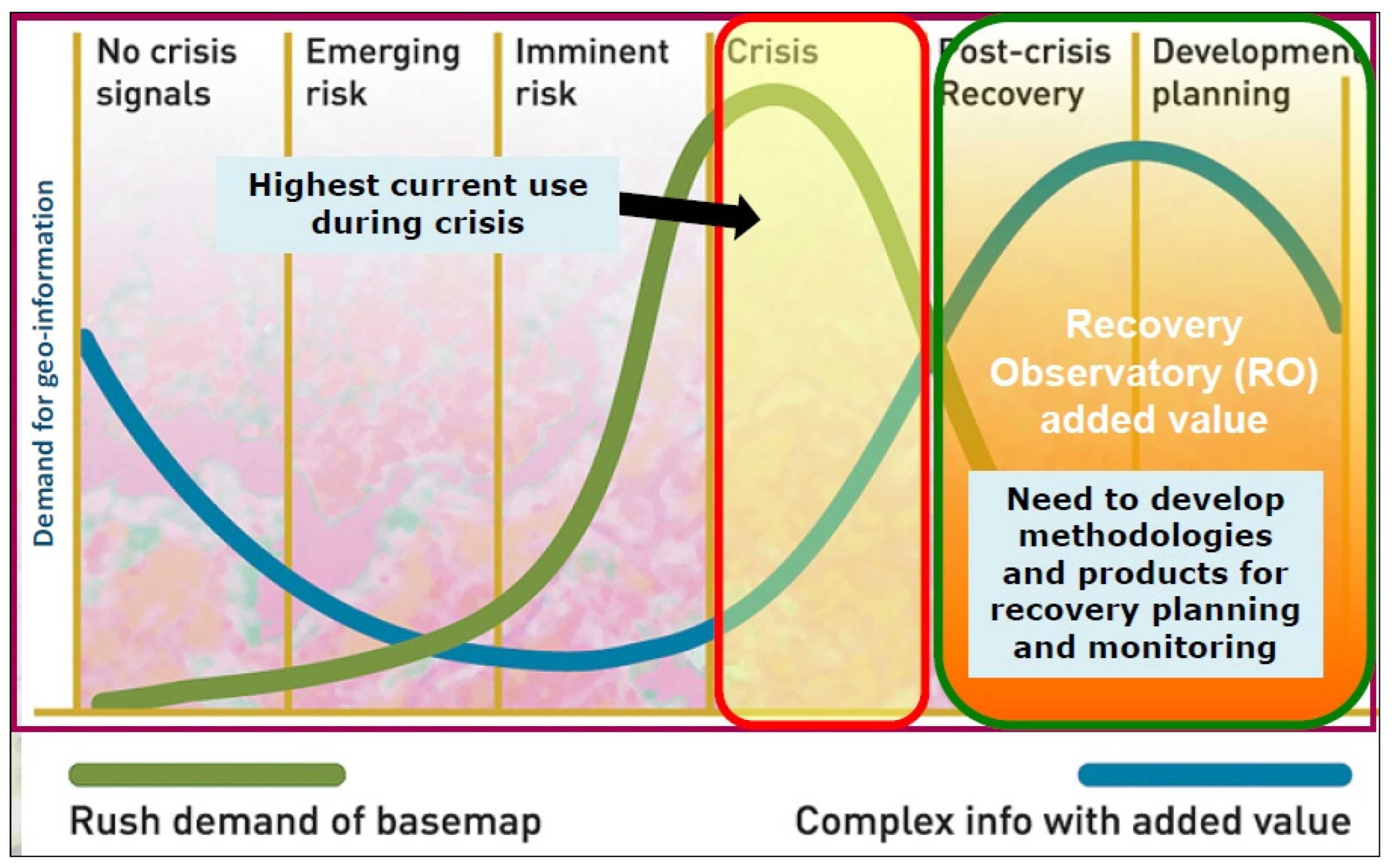 Timeline of geoinformation demand for risk analysis, response, and recovery after a natural disaster. Sketch courtesy CEOS.