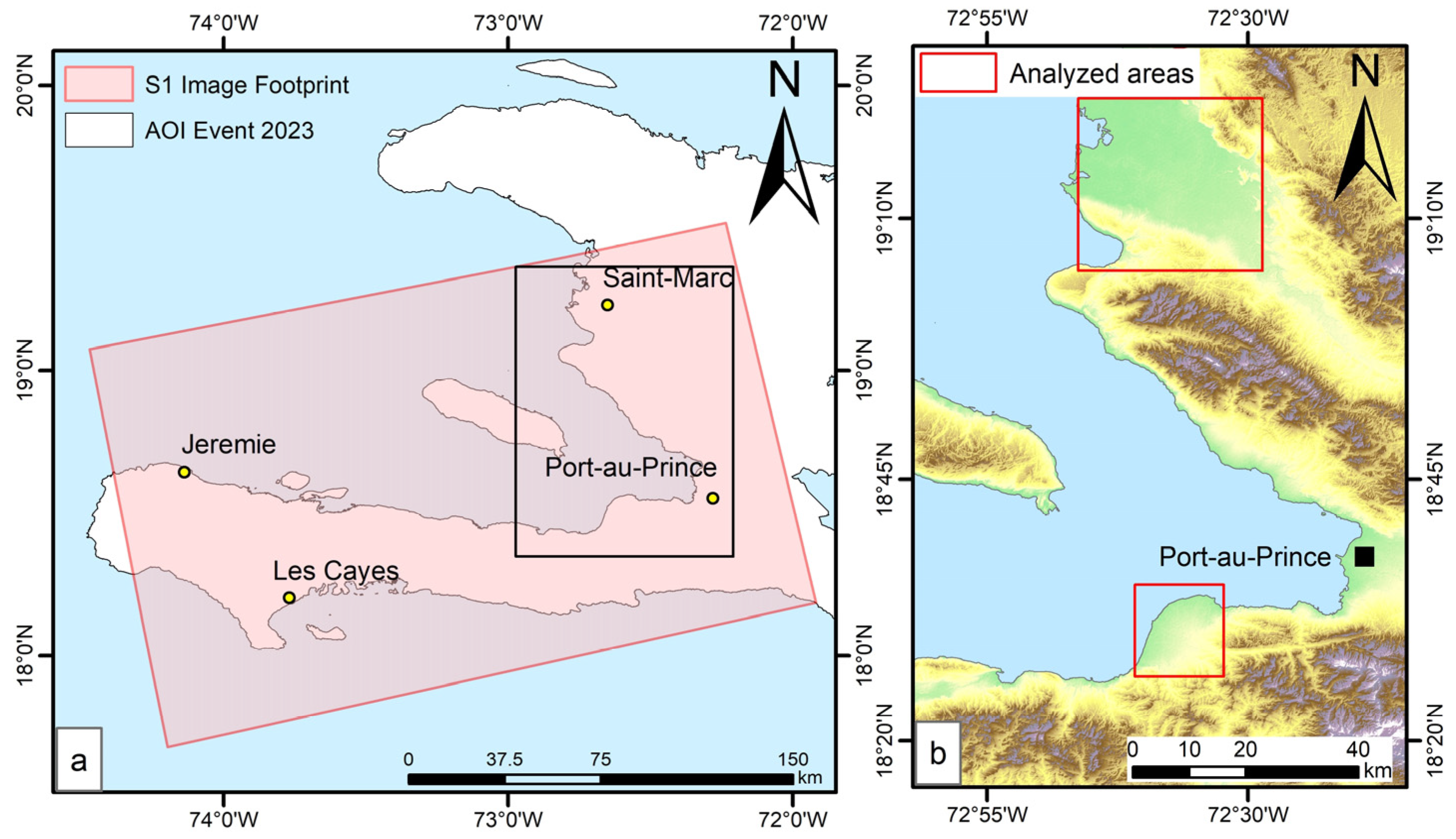 Study area of the 2023 June flooding event. (a) Spatial extent and location of the scene from the Sentinel-1 SAR image used for change detection. (b) Zoomed view of the areas of Leogane south of Port-au-Prince and Desdunes to the north that were affected by the floods and analysed.