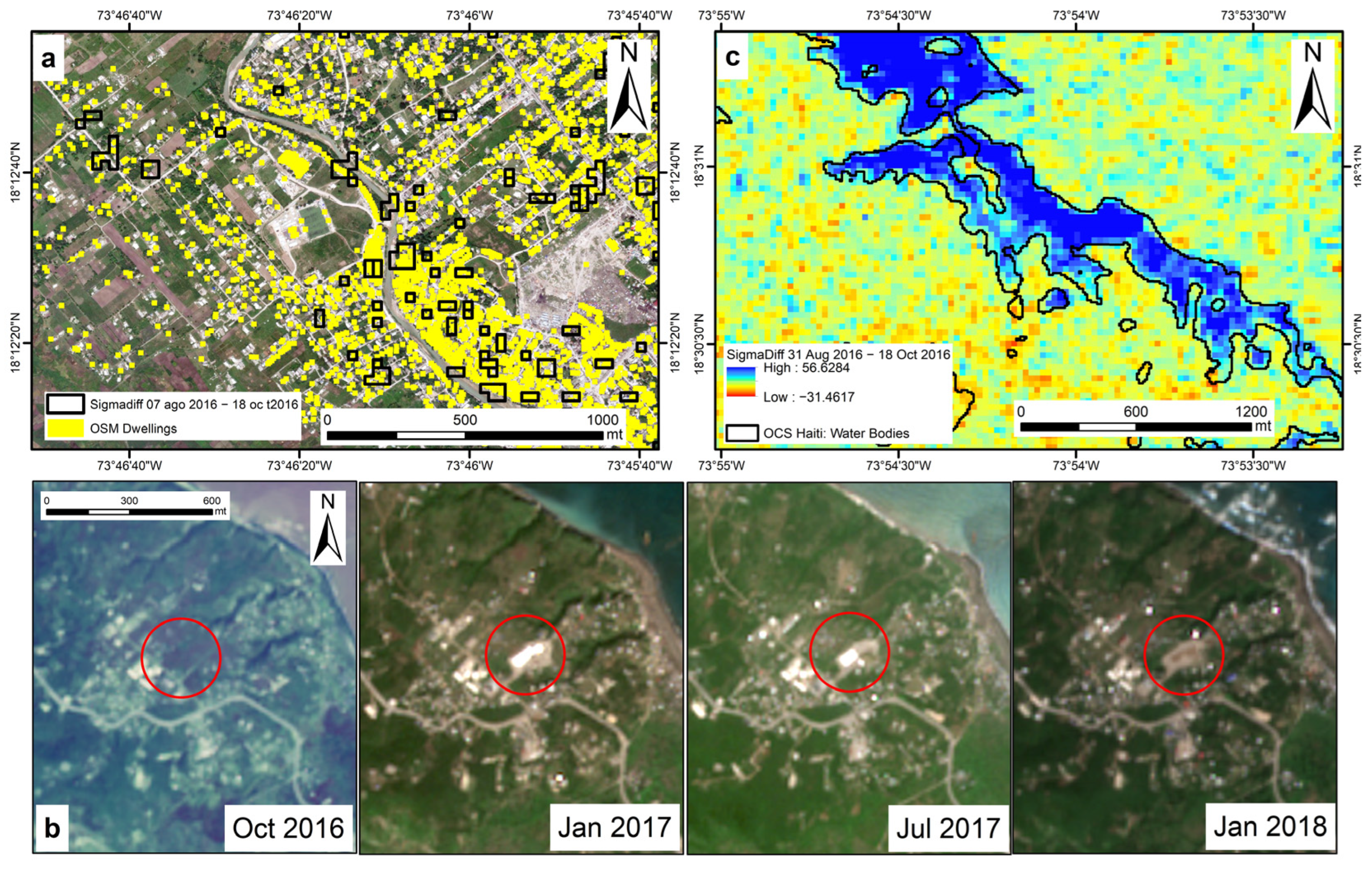 Examples of (a) geospatial intersection between SAR amplitude change pixels extracted by thresholding of Sentinel-1 change maps (black polygons) and the OSM dwellings (yellow polygons) in Les Cayes; (b) temporary humanitarian aid camp (highlighted by the red circle), south of Jérémie, from October 2016 to January 2018, detected in the Sentinel-2 optical sensor and matching with Sentinel-1 SAR amplitude change pixels suggesting backscatter increase; and (c) selection of the amplitude changes in Troupeau according to the threshold set with the water bodies layer (black) provided by the OCS_Haiti_2017 land cover dataset.