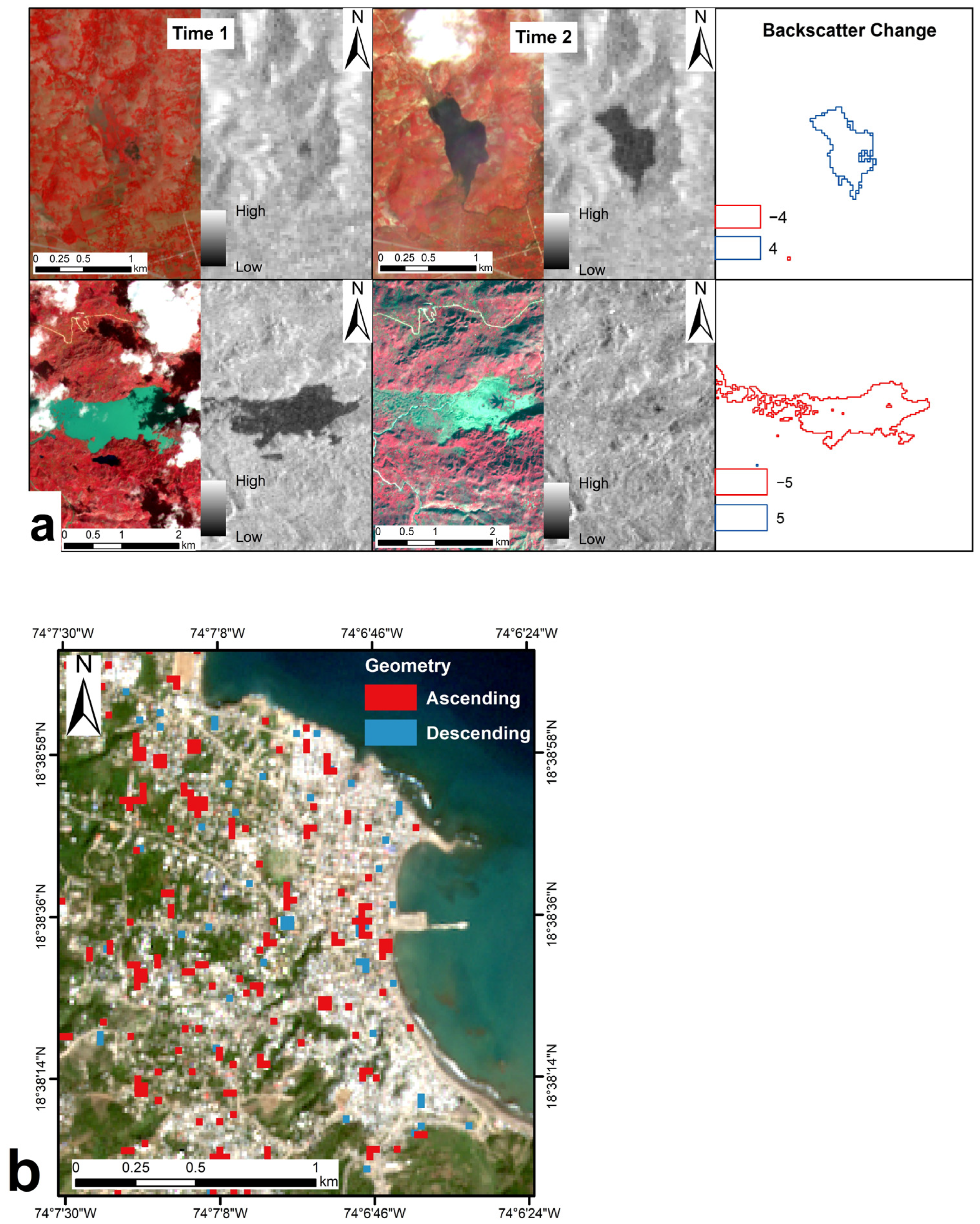 (a) Example of multi-temporal reconstruction of hurricane-induced flooding and subsequent water recession by integration of Sentinel-1 amplitude change detection and verification with Sentinel-2 false-coloured infrared (R: Band 8—NIR; G: Band 4—red; B: Band 3—green) composites. In the top row images, the value is higher at time 1, thus giving a positive backscatter change result, while, in the bottom row images, the value is higher at time 2, giving a negative backscatter change result. (b) Example of map of building changes during the second half of the recovery period in 2017 in Jérémie captured by combining ascending and descending Sentinel-1 image pairs.