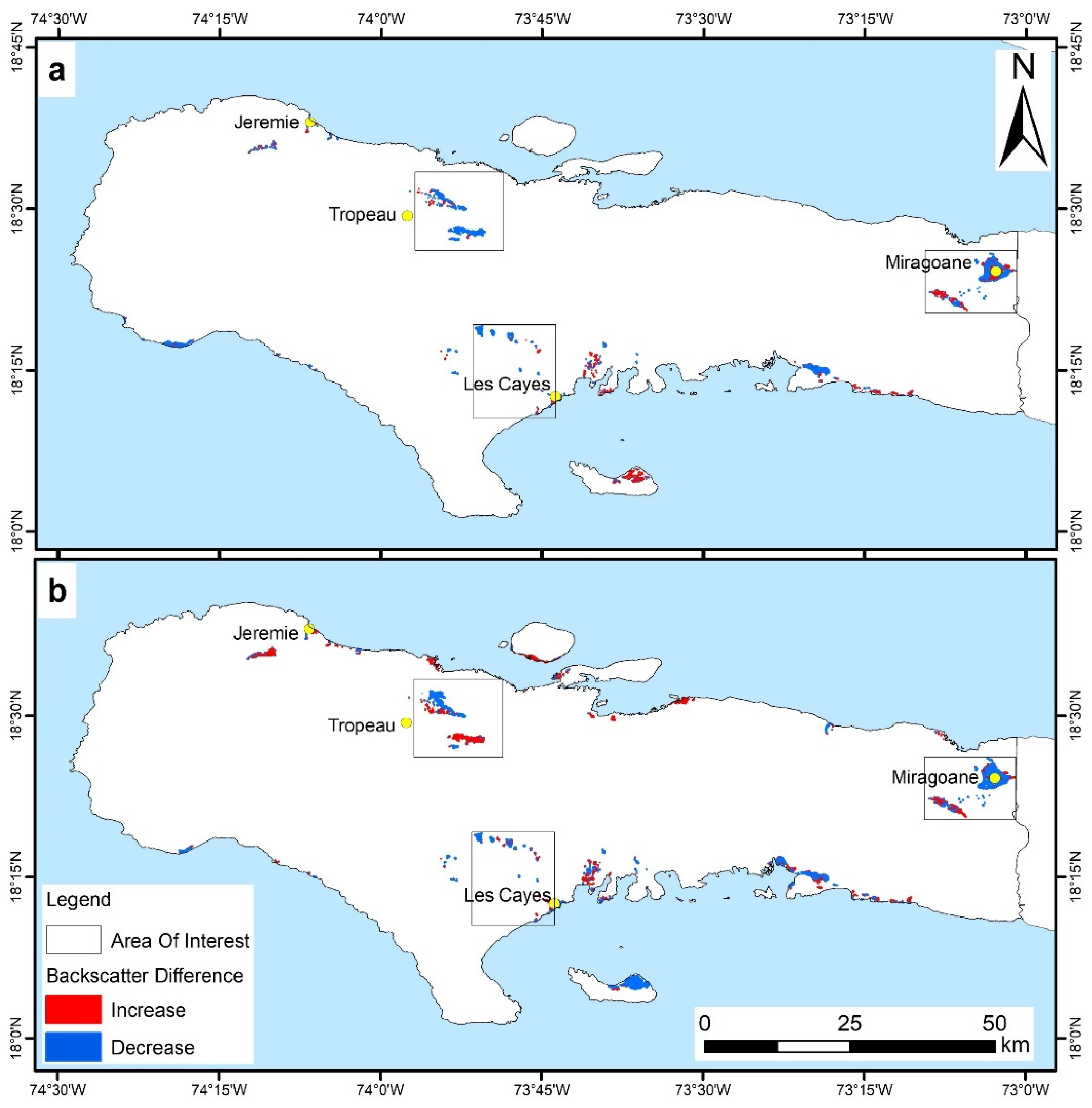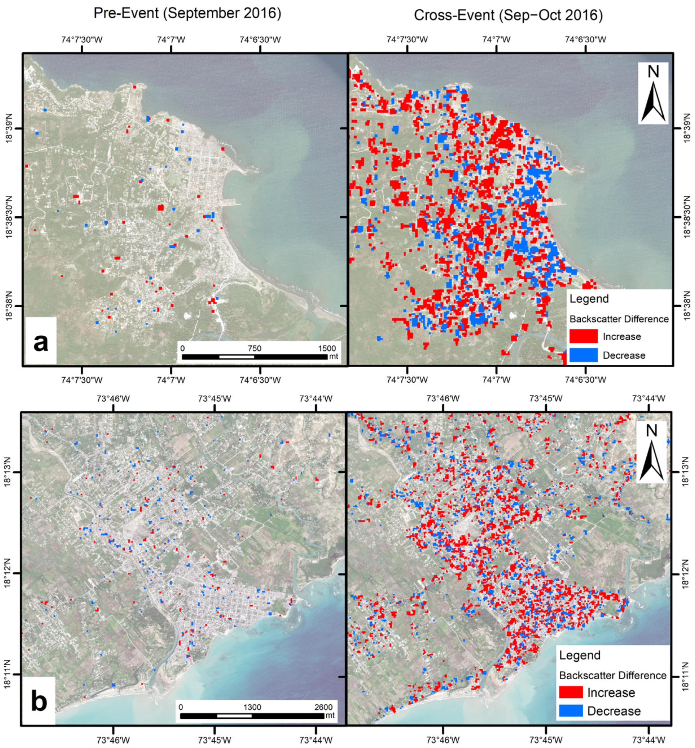 Multi-temporal thematic maps of changes due to hurricane impacts on buildings and urban settlement in (a) Jérémie and (b) Les Cayes during the pre-event and cross-event.
