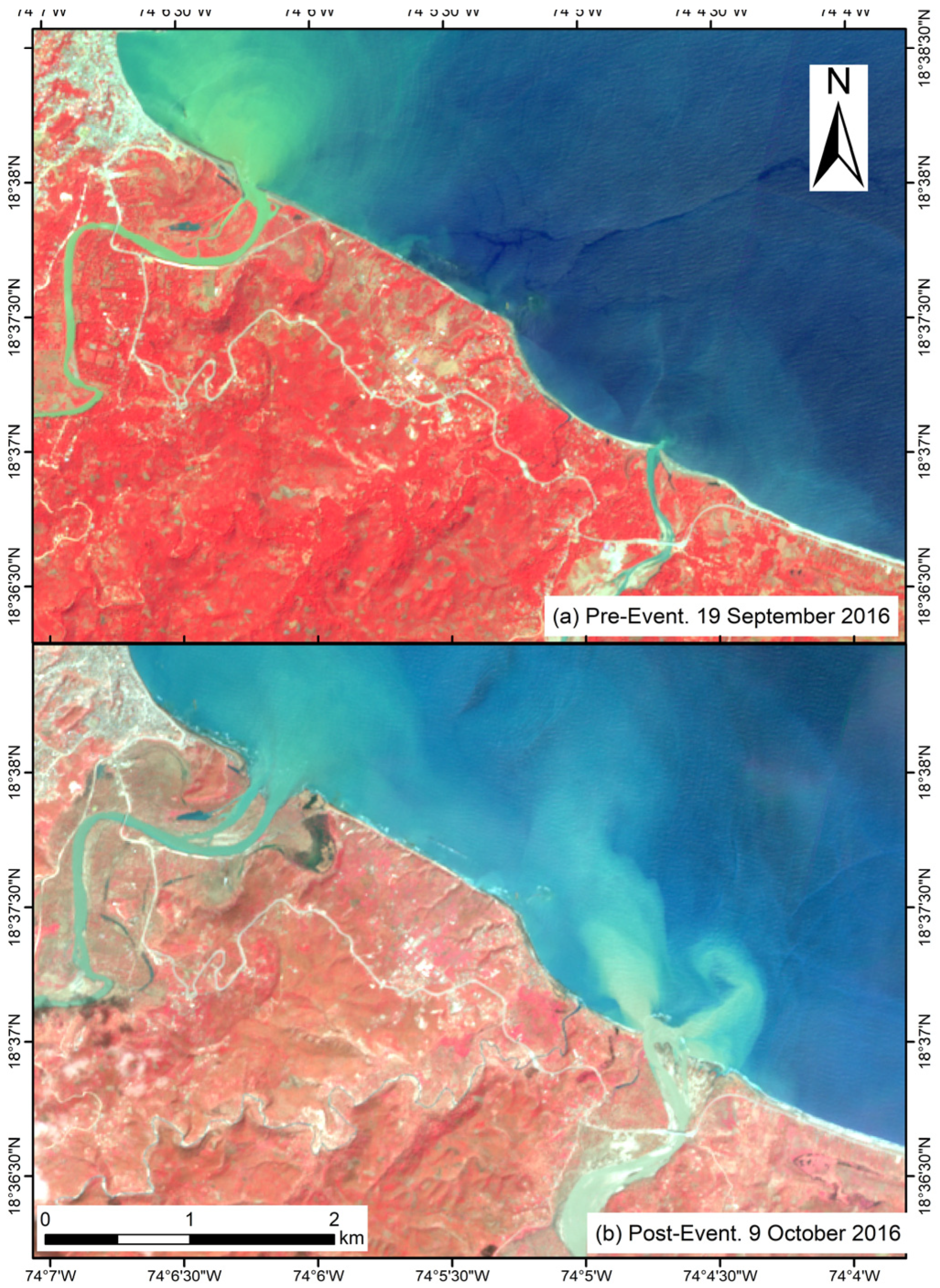 Changes along river lowlands, mouths and sediment plumes south of Jérémie, visible by comparison of Sentinel-2 images collected (a) before and (b) 5 days after the hurricane passed.