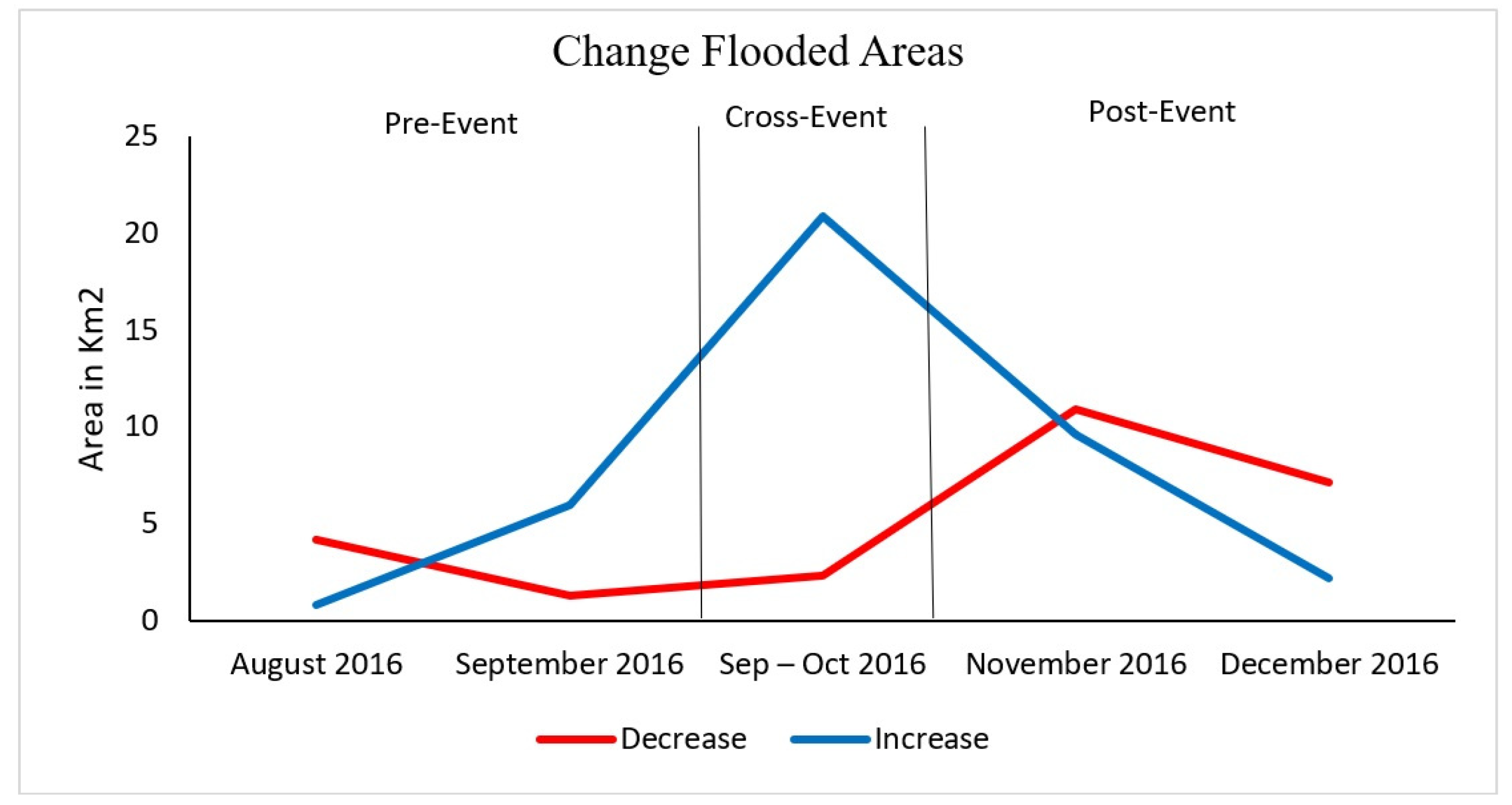 Evolution of changes in flooded areas (increase) and drained areas (decrease), after the passage of Hurricane Matthew during the different phases of the 2016 event analysis.