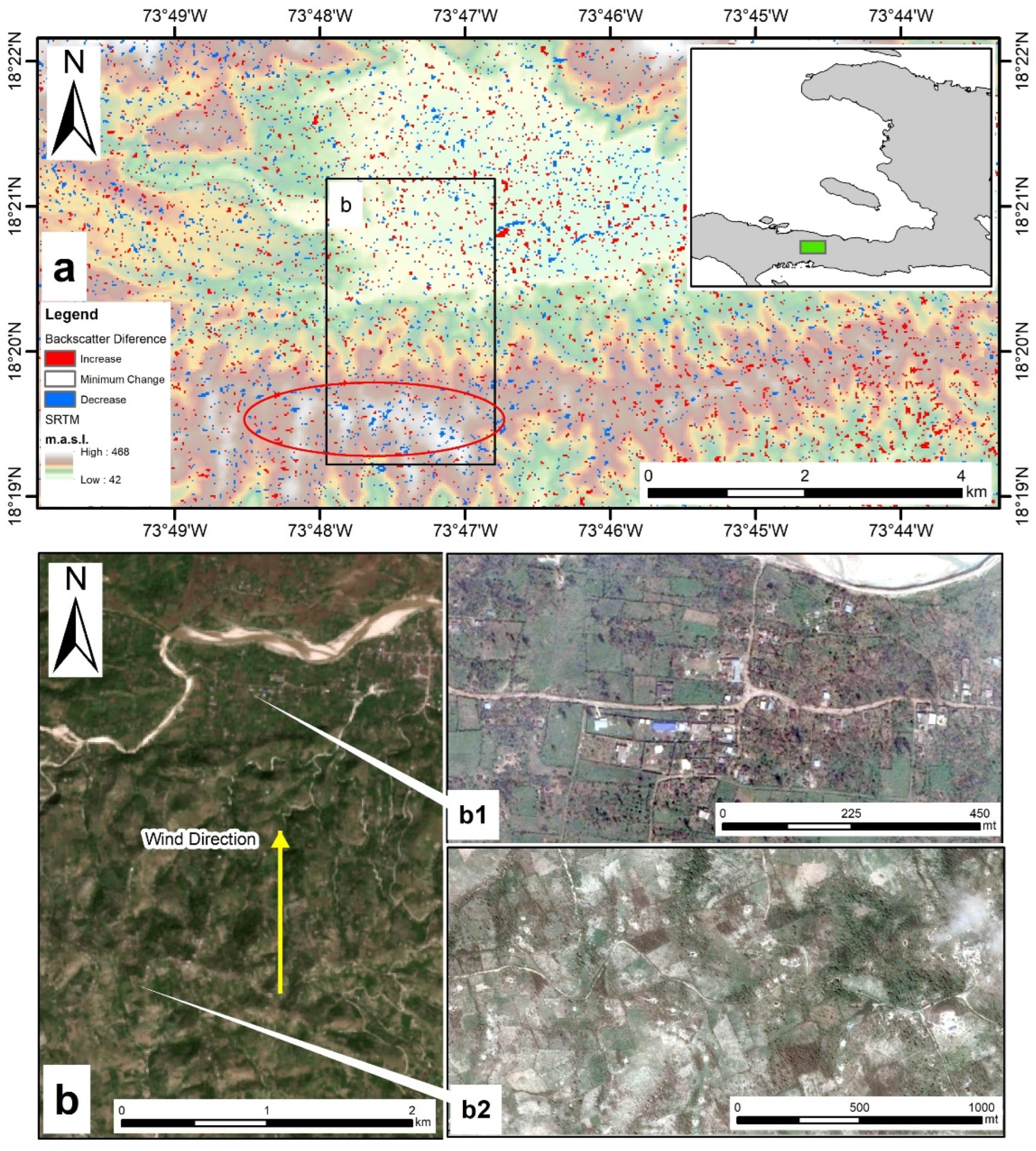 (a) Multi-temporal thematic map of changes due to hurricane impacts on the central mountainous range of Haiti, north of the agricultural district of Les Cayes, superimposed onto the Shuttle Radar Topography Mission (SRTM) Digital Elevation (DEM). (b) Zoomed view on an area where the difference in the destruction of buildings is evident from high-resolution Google Earth imagery, collected days after the passage of the hurricane in relation to strong wind direction, location and topography, between (b1) houses in the alluvial plain at the foot of the mountains (10 October 2016 image) vs. (b2) almost completely destroyed houses on the mountains (8 October 2016 image).