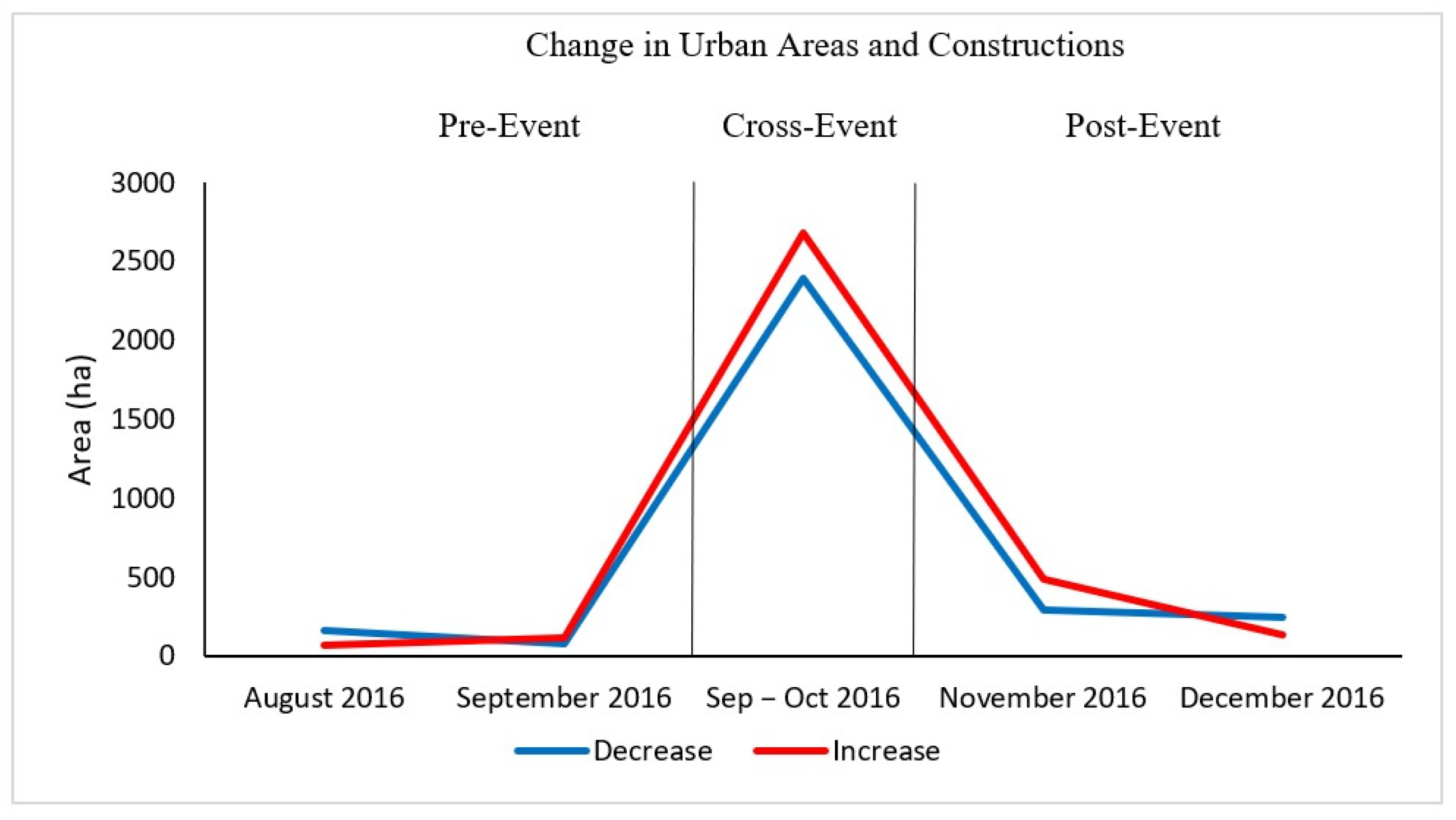 Temporal distribution of increasing (red) or decreasing (blue) changes in radar backscatter in Sentinel-1 image pairs over the built-up area of south-western Haiti that were hit by the hurricane from the pre-event up to December 2016. Area values are intentionally displayed in hectares due to the scale of the affected areas.