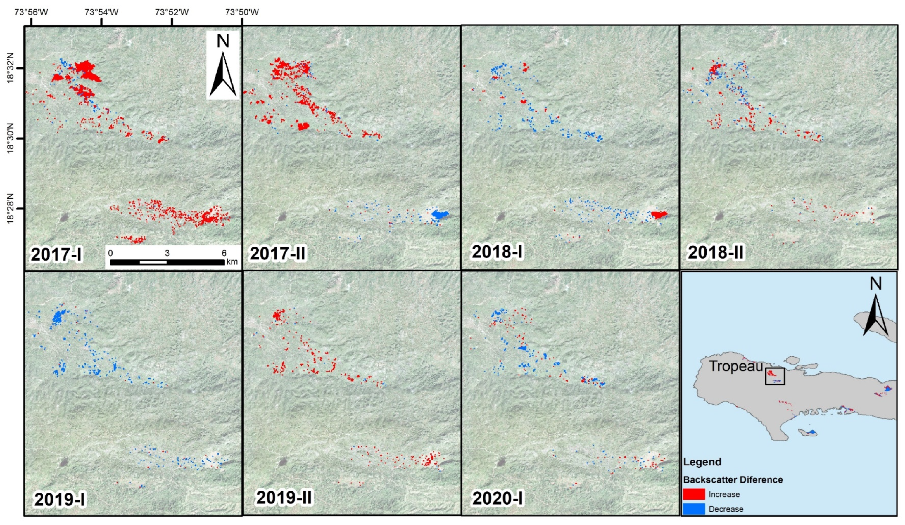 Multi-temporal thematic map of changes due to flooding and water recession during the recovery phase (2017–2020) in the area of Troupeau that was most affected in 2016 by Hurricane Matthew-induced floods.