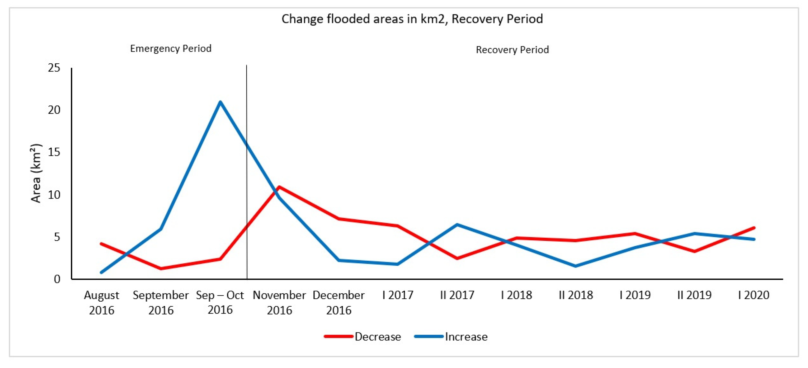 Time series of flooded areas in km2 during the recovery phase (2017–2020), compared with the emergency phase (late 2016).