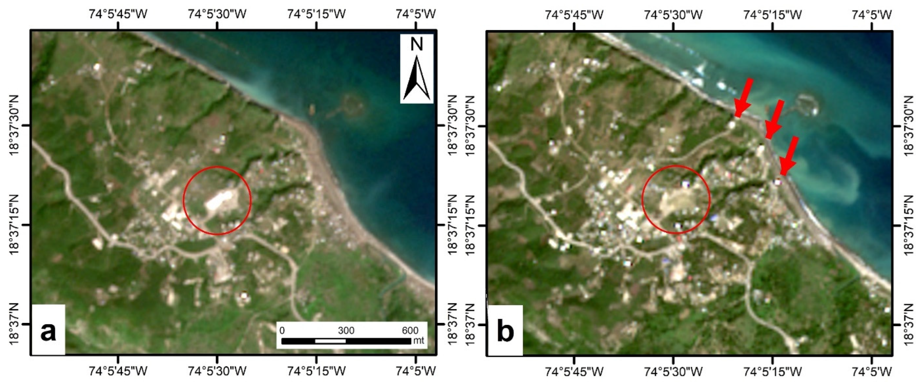 Example of visual inspection and verification with high resolution RGB Sentinel-2 images, collected on (a) 7 January 2017 and (b) 17 January 2019, to detect the appearance and dismantlement of emergency assets such as huge tents and tensile structures (see the area marked with the red circle) and new buildings near the beach (see red arrows) during the recovery phase.
