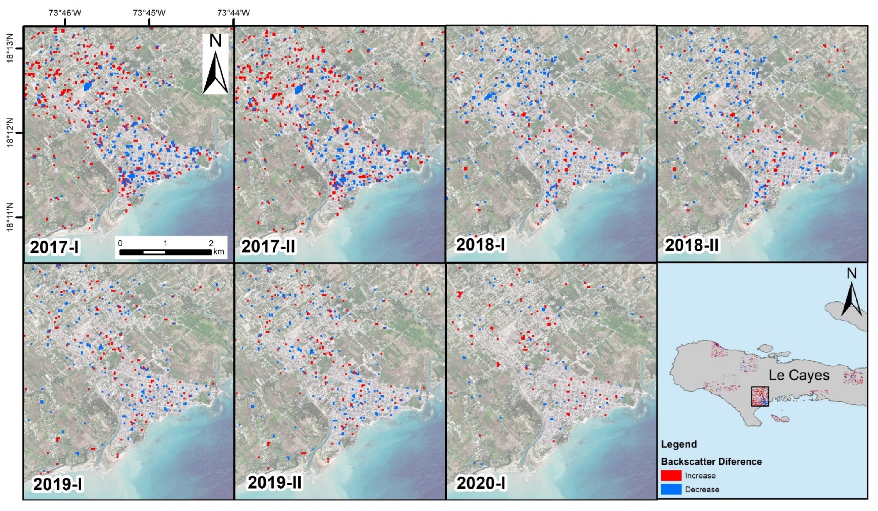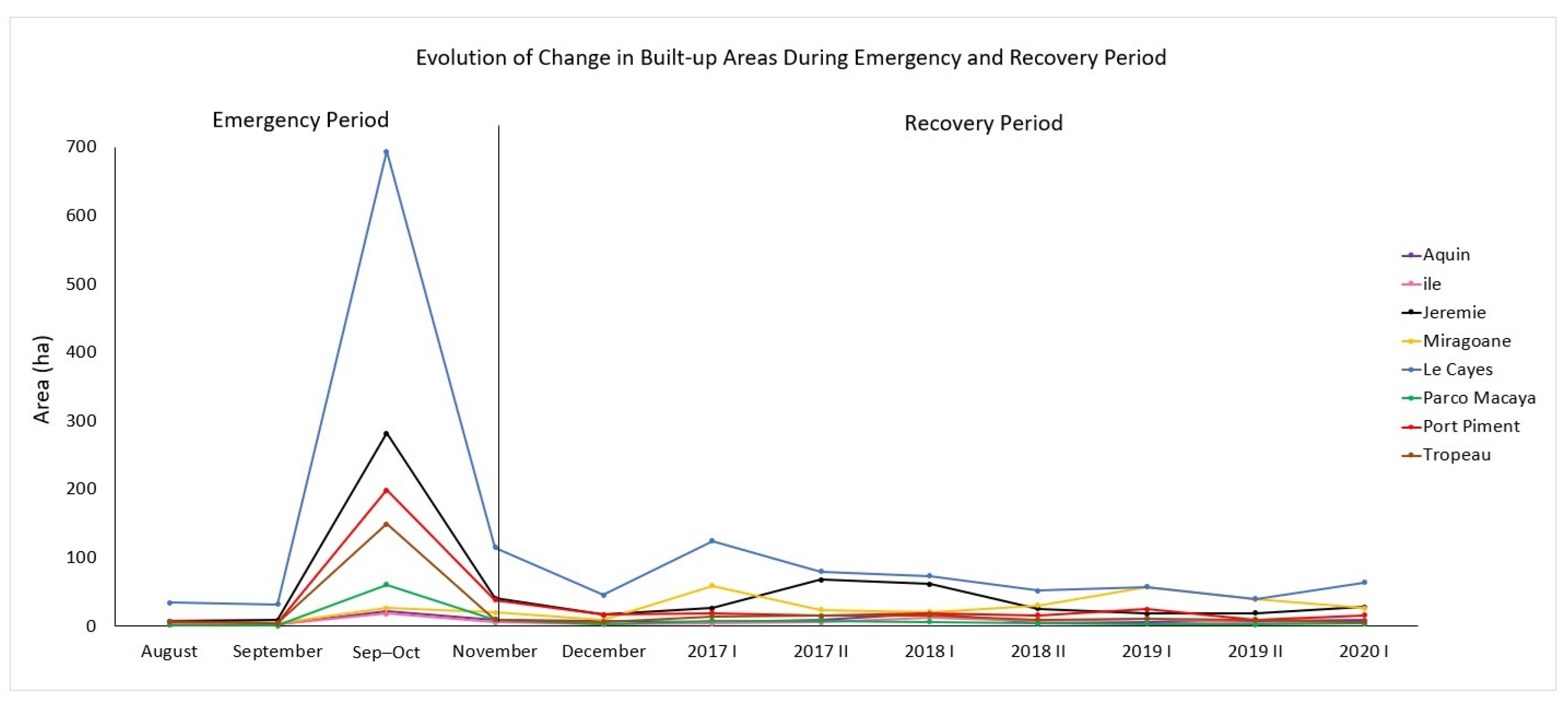 Multi-temporal thematic maps of changes due to reconstruction, new building constructions and dismantlement of emergency assets, highlighting the spatial patterns and temporal evolution of the recovery phase in Jérémie.