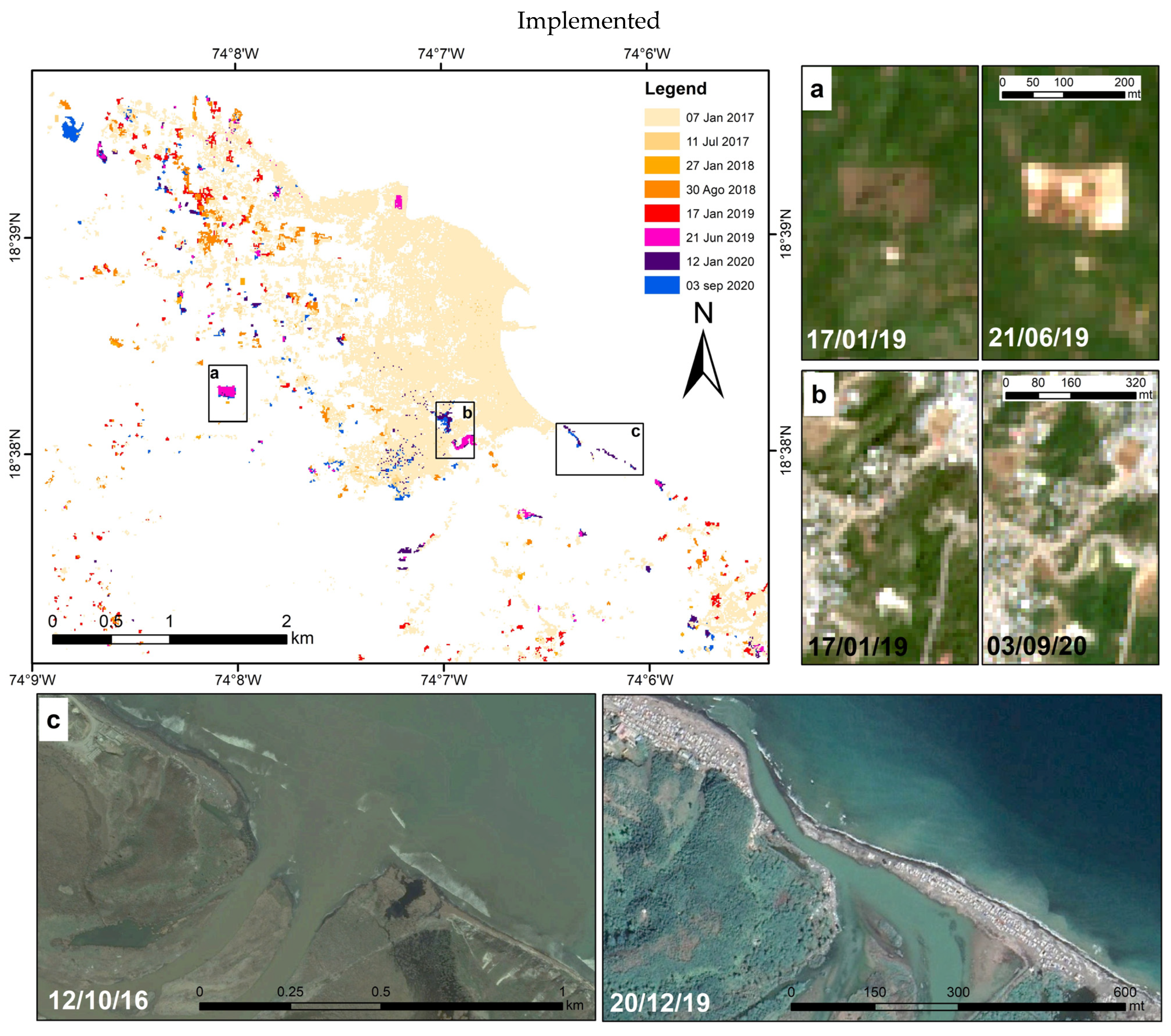 Multi-temporal urban land cover classification map of Jérémie during the recovery period from 2017 (lighter colours) to 2020 (darker colours), where clusters of new buildings and constructions are highlighted. Sentinel-2 images showing examples of (a) new construction areas and (b) new road infrastructure. (c) Comparison of Google Earth images showing new temporary constructions along the coast, south of Jérémie, in front of the Grande-Anse river mouth.