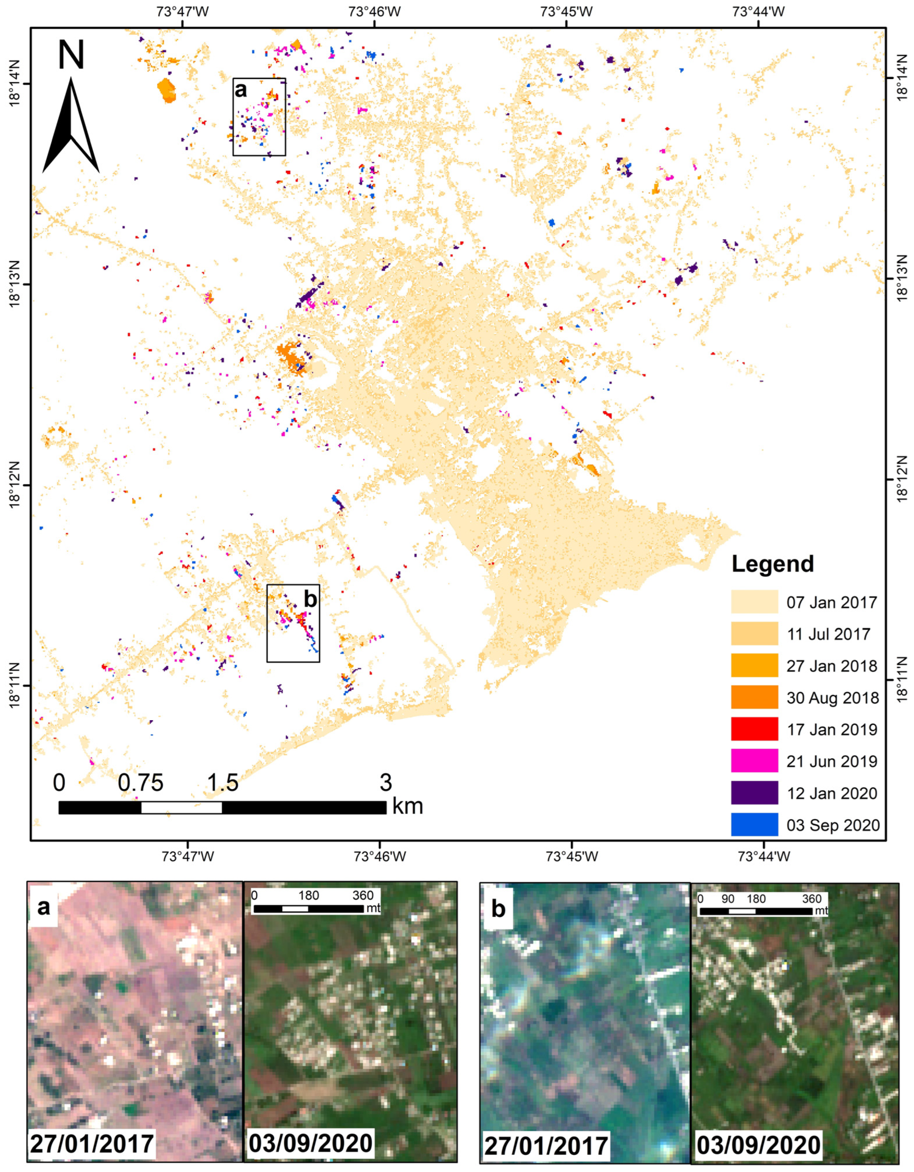 Multi-temporal urban land cover classification map of Les Cayes during the recovery period from 2017 to 2020. Sentinel-2 images showing examples of (a) new constructions in the north and (b) new constructions more aggregated and along a newly built road in the south-western part.