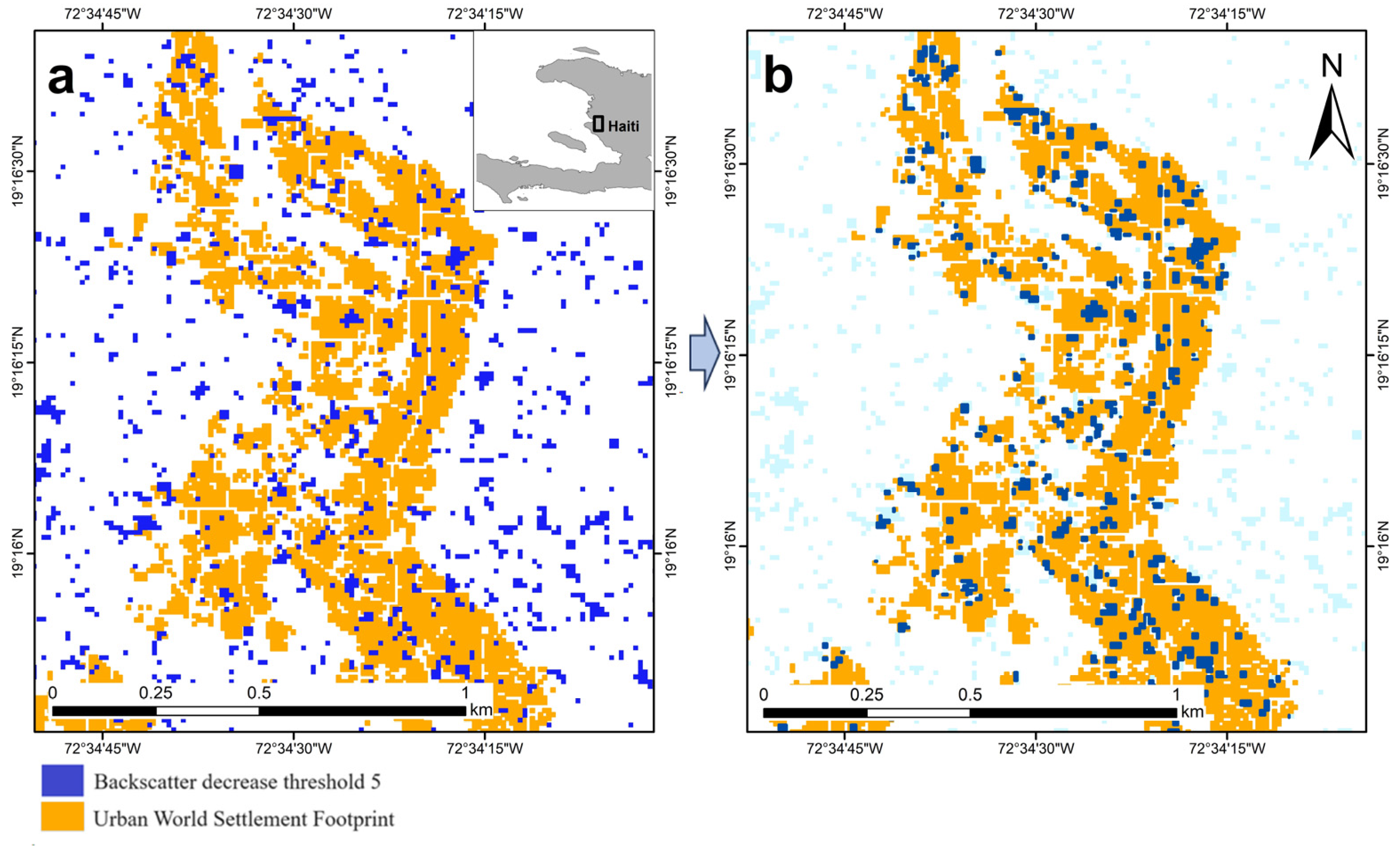 Example of impact assessment due to the 2023 flooding event in Fossé Naboth district, northern Haiti, that was among the areas with significant backscatter decrease change due to inundation: (a) initial change map after thresholding with a value equal to 5; and (b) after spatial intersection with the urban footprint as depicted in the WSF.