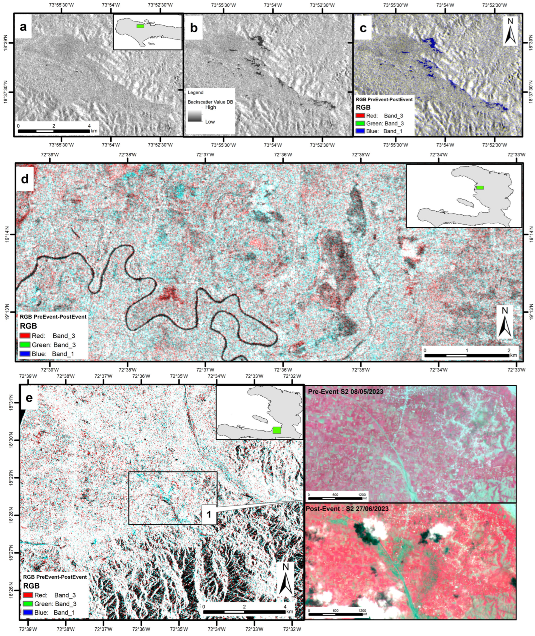 Country-scale impact assessment of the June 2023 floods. Troupeau plain as seen from Sentinel-1 (a) pre-event image (27/05/2023) and (b) post-event (08/06/2023) and (c) RGB cross-event composite image. (d) Inundation in Desdunes captured by RGB cross-event Sentinel-1 composite. (e) Floods in the Léogâne area as observed in the same cross-event Sentinel-1 composite and Sentinel-2 pre- and post-event images.