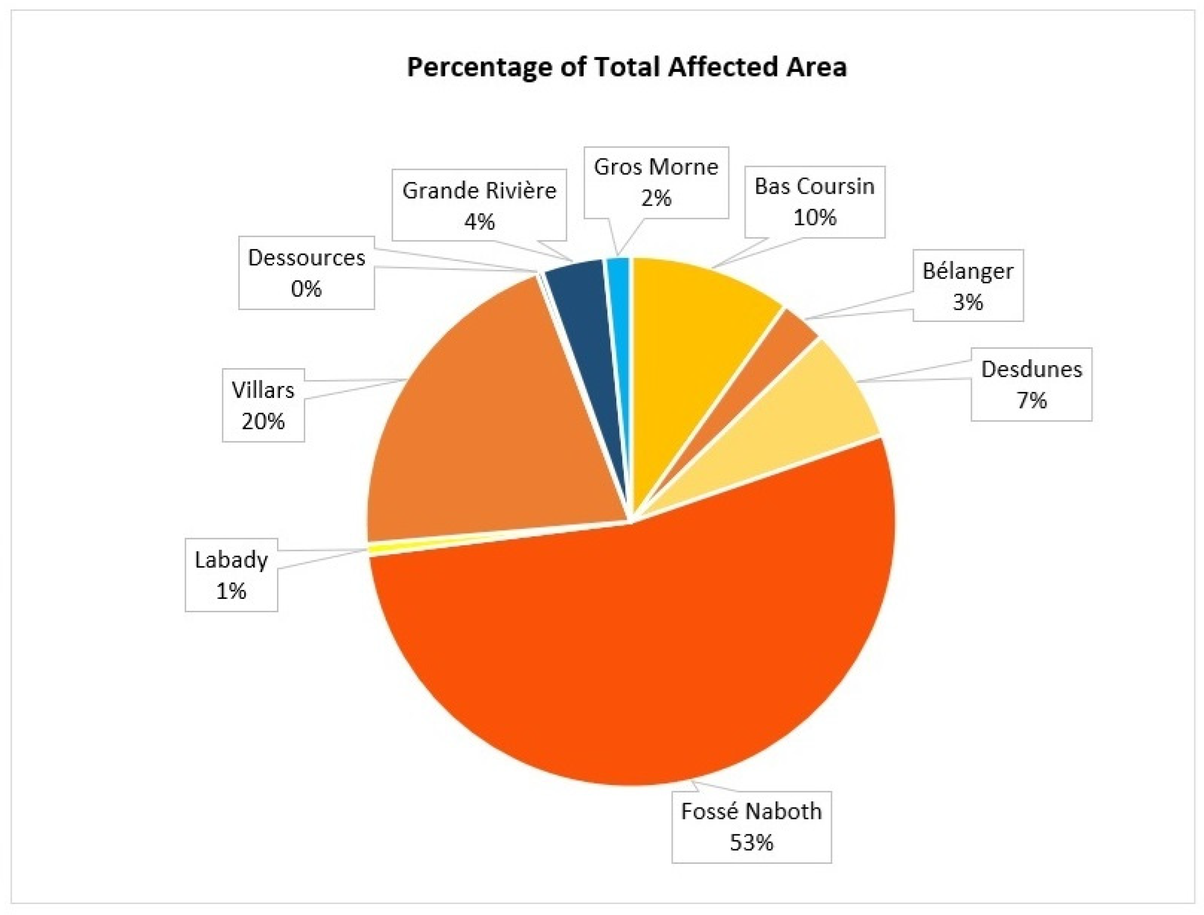 Percentage distribution of the areas affected by the 2023 June event, highlighting that the majority of them were located in the districts/towns north of Port-au-Prince, with Fossé Nabot being the most impacted.