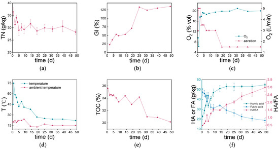Dynamic changes of temperature (a); germination index (b); O2 (c); TN (d); TOC (e); and HA, FA, and HA/FA (f) during the composting process.