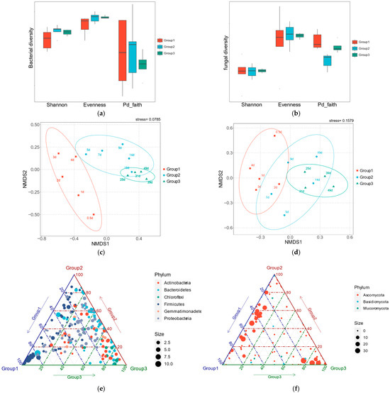 The changes in bacterial (a,c,e) and fungal (b,d,f) communities during composting. Changes in bacterial (a) and fungal (b) community α-diversity (Shannon, Evenness, and Pd_faith indexes). The NMDS of bacterial (c) and fungal (d) community composition. The relative abundances of bacterial communities (e) and fungal communities (f) at the phyla level.