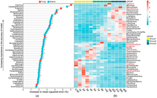 To link microbial community composition to the composting timeline, we employed a random forest model to regress the relative abundances of bacterial and fungal genera against process time (Figure 3a). The top 48 microbial biomarkers in terms of explanatory rate (p > 0.05) were identified by regressing the relative abundances against the composting time. Among these key taxa, 41 were bacteria and 7 were fungi. Most of the biomarker taxa showed a high relative abundance during the corresponding composting process (Figure 3b).
