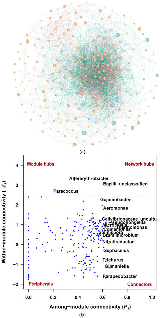 A network was constructed to analyze the interactions between bacteria and fungi during algal sludge composting. The resulting network consisted of 297 nodes (bacteria and fungi) and 3732 edges (Figure 4a). The interactions were predominantly among bacteria (91.3%), followed by bacteria-fungi (8.5%), then those among fungi (0.3%). The network analysis revealed that positive and negative correlations within the bacterial communities accounted for 46.2% and 53.8%, respectively, indicating that competitive interactions were slightly more prevalent than cooperative relationships. These positive and negative correlations reflect complex microbial behaviors such as cooperation, competition, and symbiosis [43].