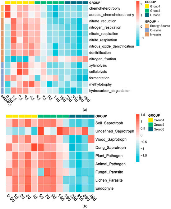 Variations in bacterial and fungal functional profiles during composting. (a) Bacterial community function (energy source, C-cycle, and N-cycle) annotated by FAPROTAX. (b) Fungal community function with an average relative abundance greater than 1% annotated by FUNGuild.