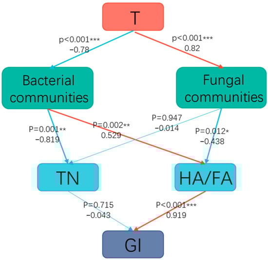 SEM illustrates the hypothesized causal relationship between bacterial and fungal communities, T, compost humification (HA/FA), TN, and GI during the composting. Red and blue arrows denote significant positive and negative path coefficients, respectively (*** p < 0.001; ** p < 0.01; * p < 0.05).