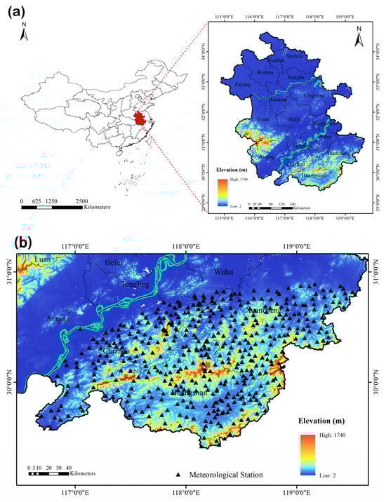 (a) Geographical location of the study area: Anhui, China, and (b) the distribution of meteorological stations.