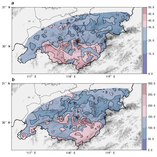 According to the daily precipitation of 459 meteorological stations in the southern mountainous area of Anhui Province from 2022 to 2024, the spatial distribution of the average precipitation and extreme precipitation of 54 rainstorm days is calculated. Figure 2a shows that the central and southern mountainous areas of Anhui Province are high-value areas for average precipitation, with dense contour lines and significantly higher local precipitation “core” than surrounding areas. The precipitation in the southern mountainous areas is generally higher than that in the north, while the precipitation in the north and east is relatively lower. The high average precipitation area corresponds well with the terrain elevation difference, indicating that mountainous terrain has a significant uplift effect on precipitation. The distribution of extreme precipitation (Figure 2b) is similar to the average precipitation, mainly concentrated in the high mountain areas of southern and central Anhui, with local extreme values being more prominent. The range of the extreme precipitation high-value area is slightly smaller than that of the average precipitation high-value area, but the spatial distribution is basically consistent, indicating that extreme rainstorm events are also significantly affected by terrain and water vapor transport. The extreme precipitation in the western and central regions is slightly higher than that in the eastern region, while the precipitation in the eastern region is relatively uniform but without extreme high values.