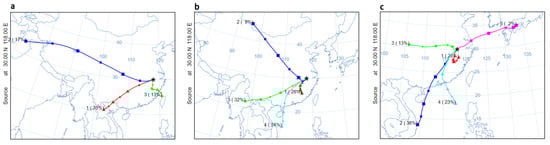 Spatial distributions of water vapor transport channels at (a) 500 hPa, (b) 700 hPa, and (c) 850 hPa. The numbers at the end of each clustered trajectory line represent a specific cluster number, and the numbers in brackets indicate the proportion of the number of trajectories of this cluster to the total trajectories. The solid lines of red, blue, green, lake blue, and purple represent the 1–5 clustering tracks. The black star represents the Southern Anhui Mountains.