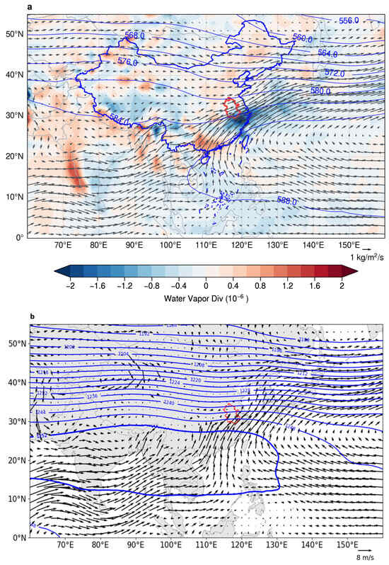 Climate field distribution of (a) whole layer integrated water vapor flux (arrows, units: kg/m2/s) and its divergence (shaded, units: 10−6 g·(cm−2·hpa·s)−1), 500 hPa geopotential height (blue isolines, unit: dagpm), and (b) 850 hPa wind field (arrow, units: m/s), 200 hPa geopotential height (blue isolines, units: dagpm) of rainstorm events in the mountainous area of southern Anhui Province from 2022 to 2024. The red area indicates Anhui Province.
