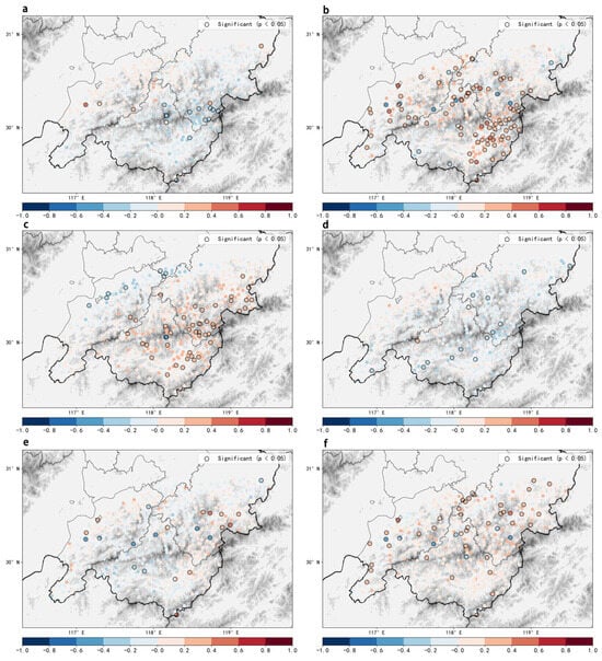 Correlation between circulation index and rainstorm event precipitation (p < 0.05 marked by circle): (a) EAM index, (b) IOBM, (c) zonal index, (d) PM index, (e) WPSH index, (f) SAH index.