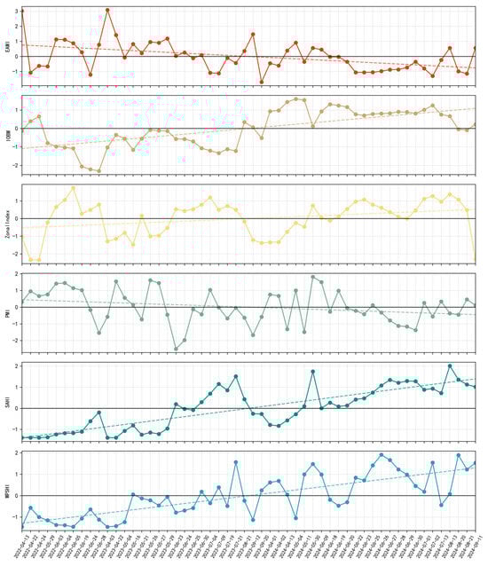 Time series diagram of circulation index (standardized) of rainstorm events in the mountainous area of southern Anhui Province from 2022 to 2024.