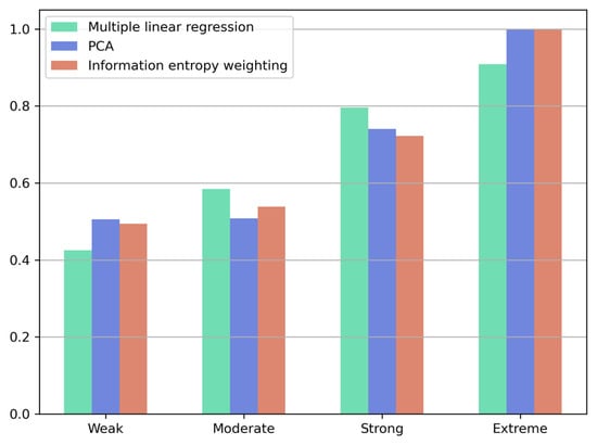 However, there are differences among the three methods in the identification of disaster-causing rainstorms. At moderate and above levels, the number of disaster-causing rainstorm days assessed by the multiple linear regression method accounted for a high proportion of 70.0% of the same level of rainstorm days, while the number of disaster-causing rainstorm days accounted for the lowest proportion of rainstorm days at the weak level, only 42.5% (Figure 7). It is possible to use the comprehensive intensity index classification of rainstorm days to estimate the disaster-causing nature of rainstorms and more effectively judge the disaster risk of rainstorms. Compared with the polynomial fitting method, the PCA method and the information entropy weight method only perform slightly better in identifying the days of extremely strong disaster-causing rainstorms, which means that the method is more capable of grading at the extreme level.