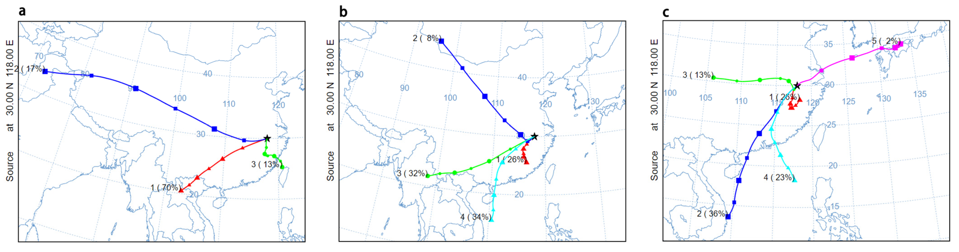 - Yang, H.; Jiang, Z.; Liu, Z.; Zhang, Q. Analysis of climatic characteristies of water vapor transport based on the Lagrangian method: A comparison between Meiyu in the Yangtze-Huaihe River region and the Huaibei rainy season. Chin. J. Atmos. Sci. 2014, 38, 965–973. [Google Scholar]