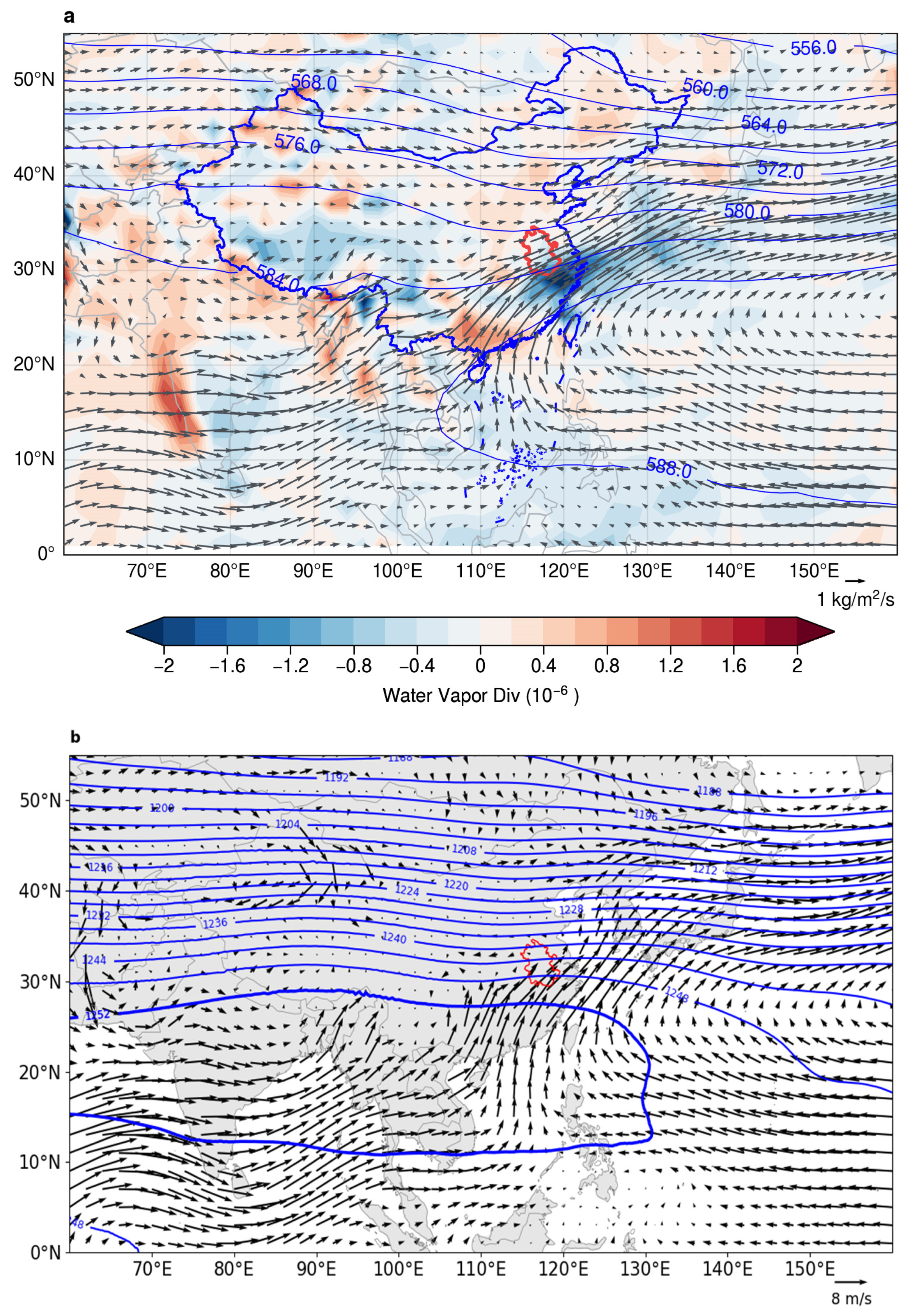 - The atmospheric circulation systems such as the WPSH, EASM, and SAH play a decisive role in regulating water vapor transport, convergence, and spatiotemporal variability of precipitation in the southern Anhui region. Especially with the westward extension and northward jump of WPSH, a channel for continuous invasion of warm and humid air currents has been formed. Combined with the synergistic effect of the westerly belt and monsoon system, it enhances the dynamic uplift, which is conducive to the occurrence of extreme precipitation.